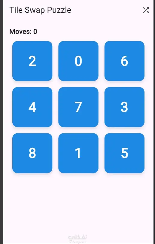 A Shuffle button in the AppBar randomizes the tiles to start a new round.
