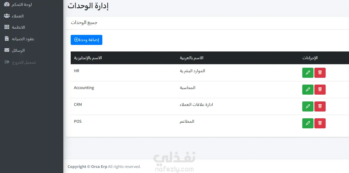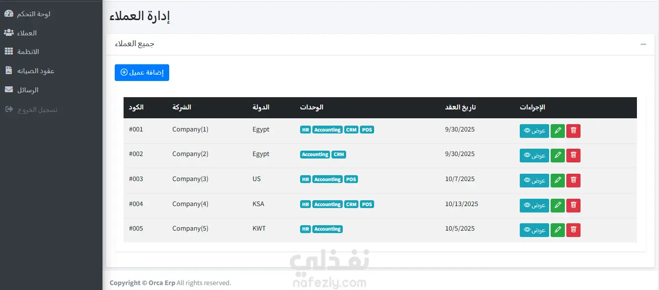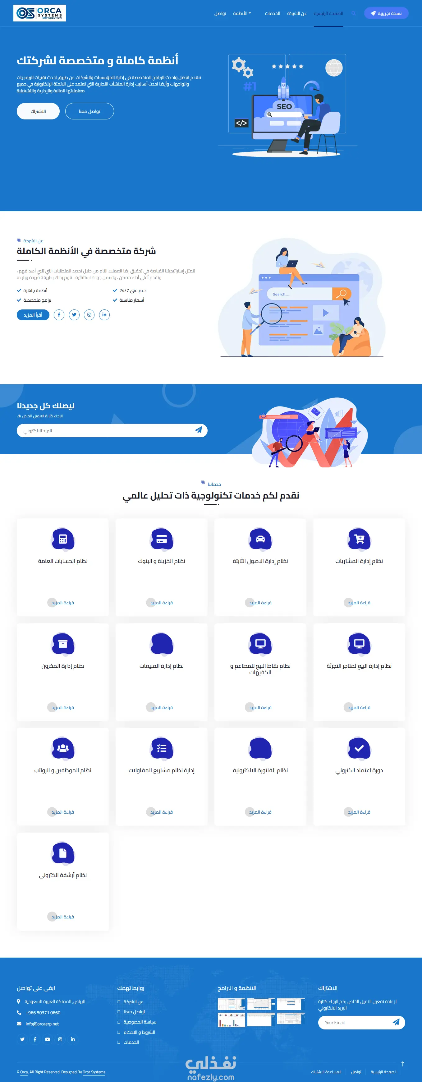 موقع لشركة OrcaErp لخدمات الانظمه والبرامج مع لوحة تحكم للإدارة وتقارير تفاعلية لإدارة العملاء، العقود، والرسائل.