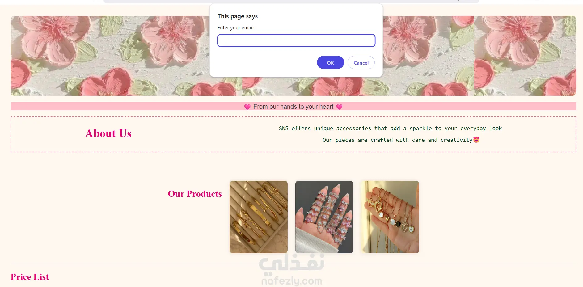 يتضمن الموقع أقسامًا أساسية مثل: من نحن، قائمة الأسعار، منتجاتنا، مع لمسات تفاعلية بسيطة مثل نافذة إدخال البريد الإلكتروني للتواصل أو الاشتراك.