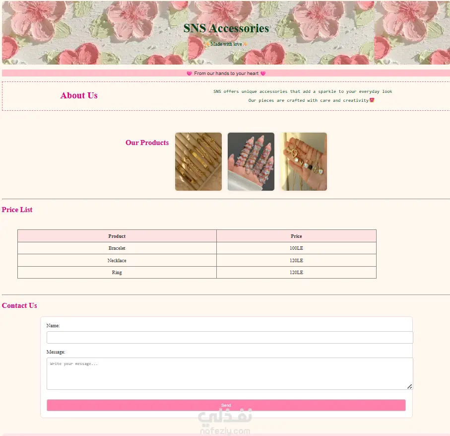 موقع إلكتروني أنيق مخصص لعرض وبيع الإكسسوارات اليدوية من علامة SNS.