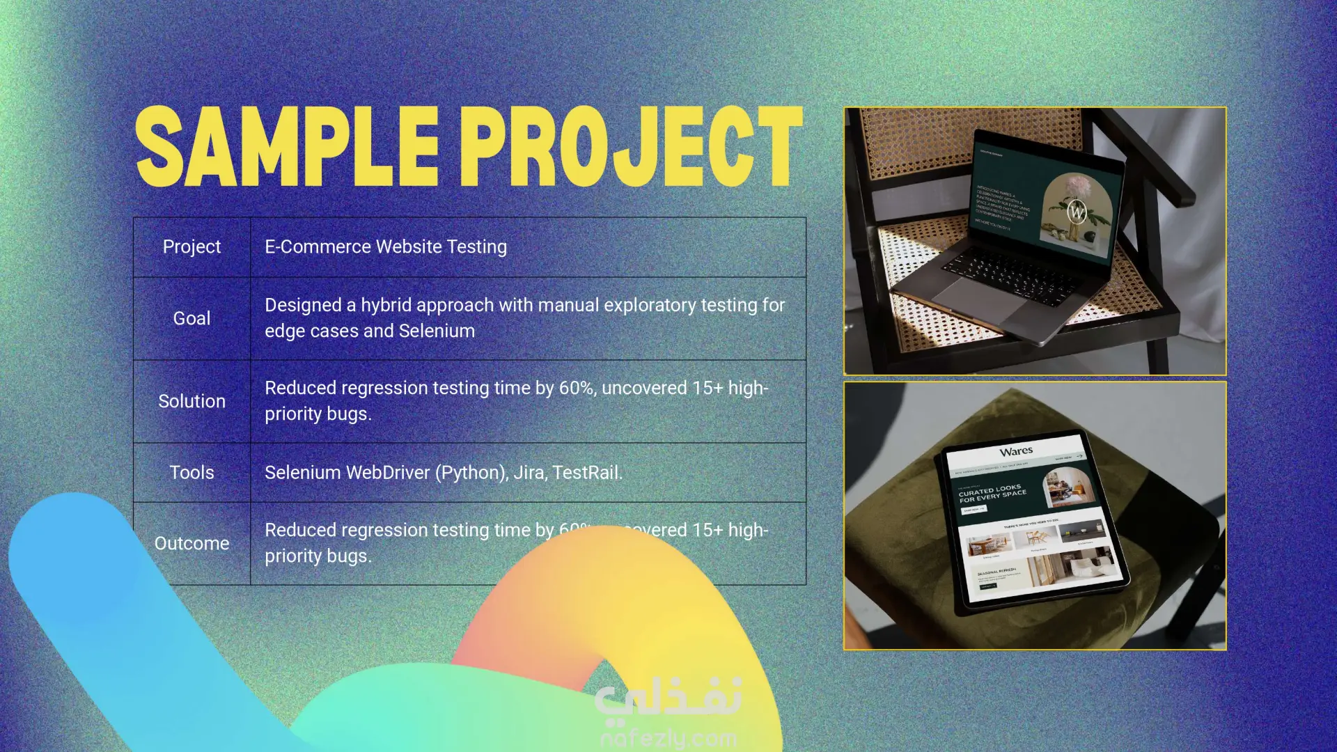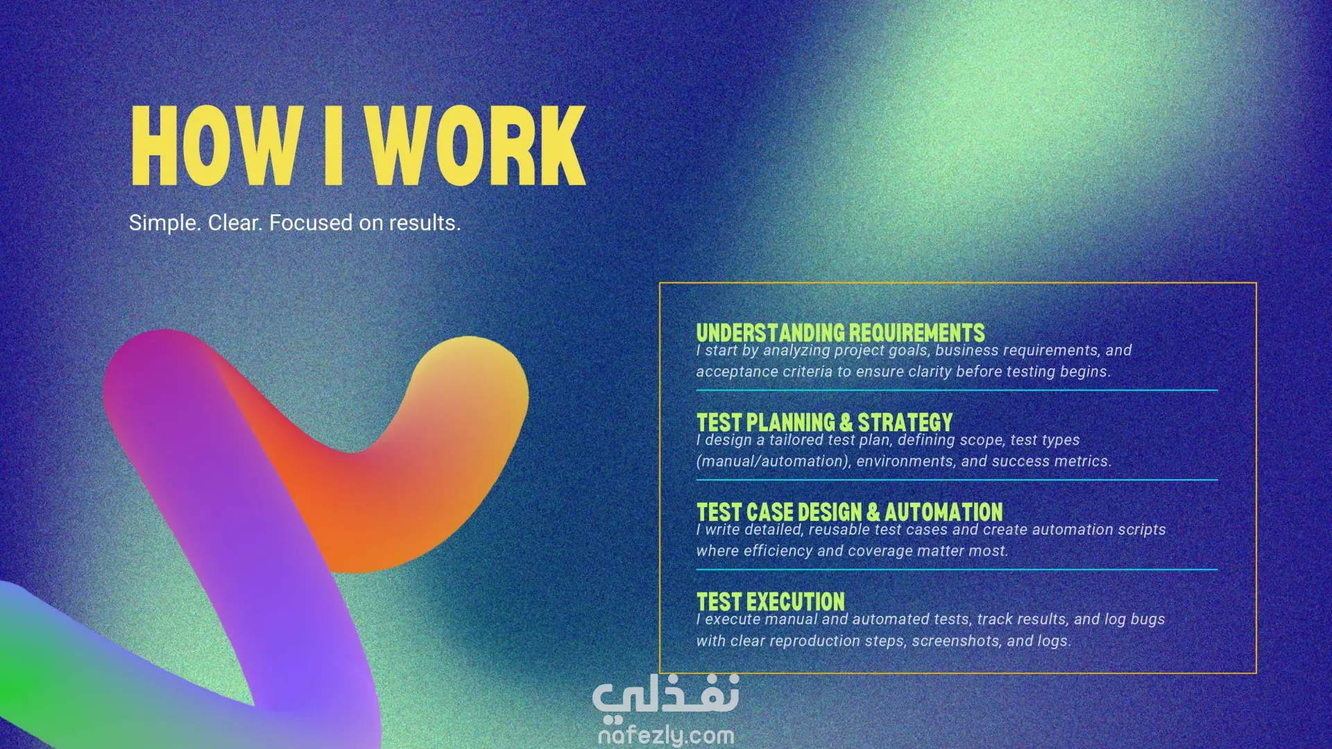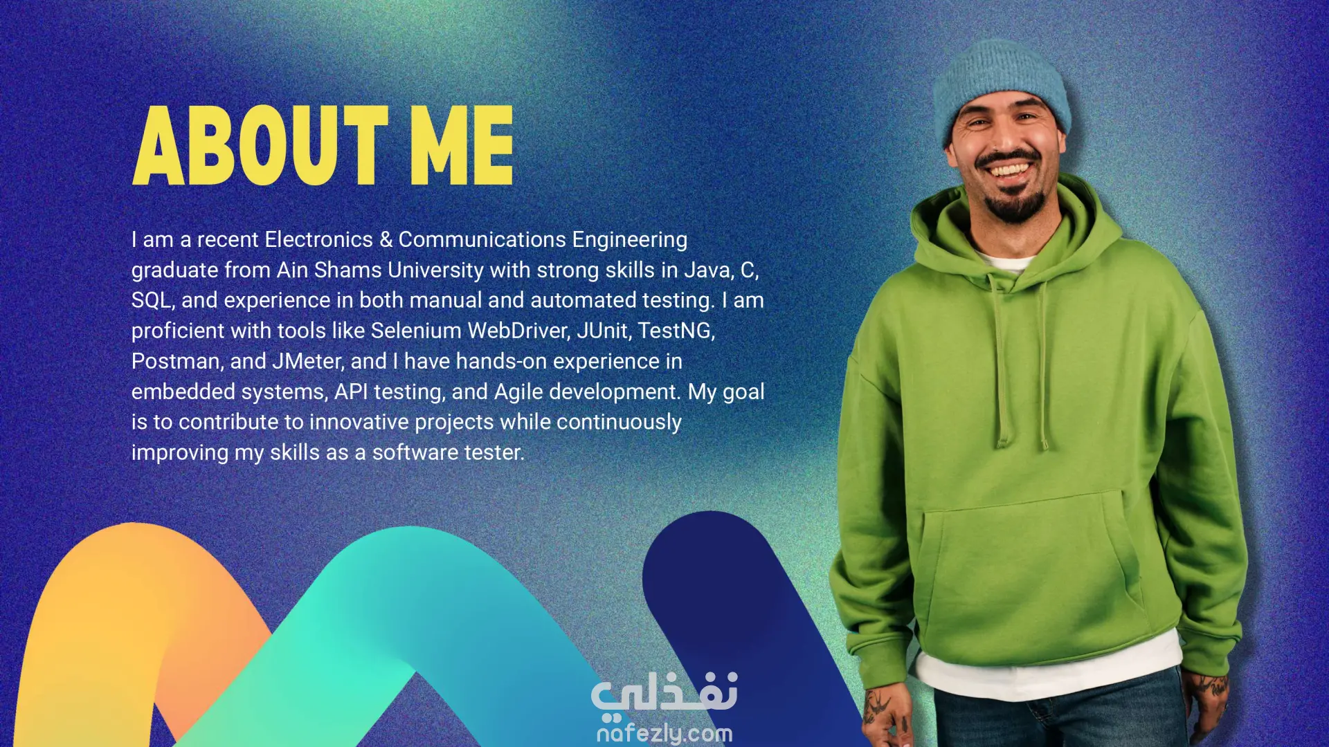 قمتُ بتصميم وتطوير عرض تقديمي احترافي لملف أعمال يبرز مهاراتي وخدماتي ومشاريعي في مجال اختبار البرمجيات. يعرض الملف خلفيتي في هندسة الإلكترونيات والاتصالات، وخبرتي في Java و C و SQL، وتجربتي في الاختبار اليدوي والآلي باستخدام أدوات مثل Selenium WebDriver و JUnit و TestNG و Postman و JMeter. الأقسام الرئيسية في الملف: نبذة عني – مقدمة عن خلفيتي الأكاديمية، مهاراتي التقنية، وأهدافي المهنية في مجال اختبار البرمجيات. الخدمات المقدمة – الاختبار اليدوي، توثيق الاختبارات، الاختبار الآلي، اختبار الـ API وقواعد البيانات، اختبار الأداء، واستشارات الـ QA وفق المنهجيات الرشيقة. الأدوات والتقنيات – استعراض خبرتي العملية مع أُطر العمل الخاصة بالاختبار، أنظمة تتبع العيوب، وأدوات الأتمتة. القطاعات المستهدفة – مثل التجارة الإلكترونية، الرعاية الصحية، التكنولوجيا المالية، السيارات وإنترنت الأشياء، التعليم الرقمي، وتطبيقات SaaS. مشروع تجريبي – اختبار يدوي وآلي لموقع تجارة إلكترونية، أسفر عن تقليص وقت اختبار الانحدار بنسبة 60% واكتشاف أكثر من 15 خطأ عالي الأولوية. تجارب العملاء – آراء تؤكد جودة الاختبارات، الالتزام بالمواعيد، وقيمة الأتمتة في تحسين الأداء. آلية العمل – شرح واضح لخطوات العمل: تحليل المتطلبات، تخطيط الاختبارات، تصميم الحالات، التنفيذ، والتقارير. النتيجة: يوفر هذا الملف عرضًا منظمًا واحترافيًا لخبرتي في مجال اختبار البرمجيات، مما يساعد العملاء وأصحاب العمل المحتملين على فهم قيمتي بسرعة كـ مهندس اختبار برمجيات.
