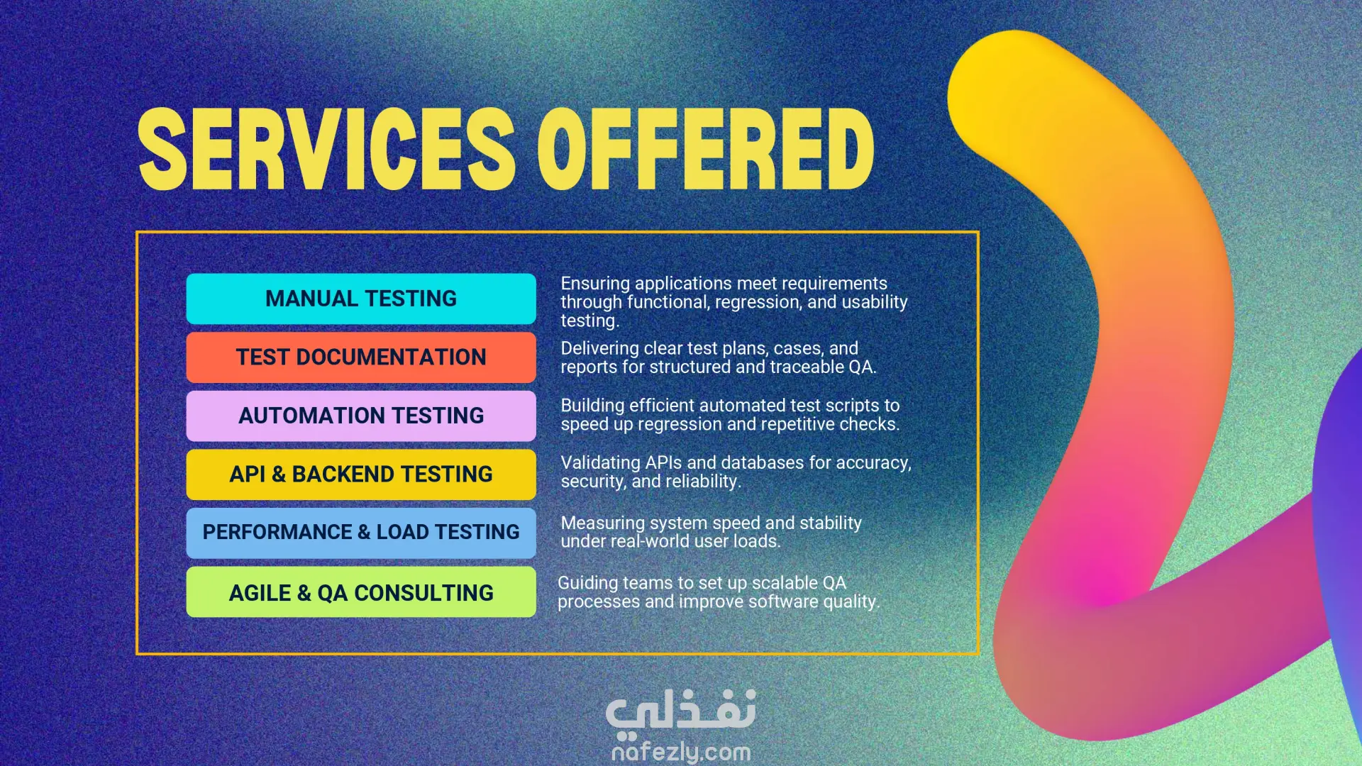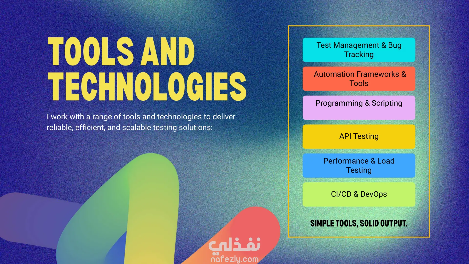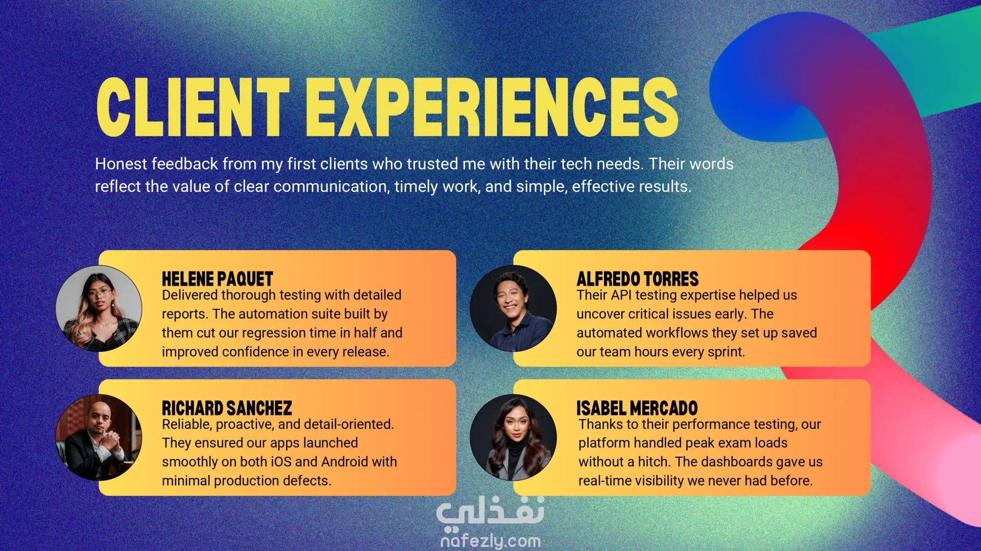قمتُ بتصميم وتطوير عرض تقديمي احترافي لملف أعمال يبرز مهاراتي وخدماتي ومشاريعي في مجال اختبار البرمجيات. يعرض الملف خلفيتي في هندسة الإلكترونيات والاتصالات، وخبرتي في Java و C و SQL، وتجربتي في الاختبار اليدوي والآلي باستخدام أدوات مثل Selenium WebDriver و JUnit و TestNG و Postman و JMeter. الأقسام الرئيسية في الملف: نبذة عني – مقدمة عن خلفيتي الأكاديمية، مهاراتي التقنية، وأهدافي المهنية في مجال اختبار البرمجيات. الخدمات المقدمة – الاختبار اليدوي، توثيق الاختبارات، الاختبار الآلي، اختبار الـ API وقواعد البيانات، اختبار الأداء، واستشارات الـ QA وفق المنهجيات الرشيقة. الأدوات والتقنيات – استعراض خبرتي العملية مع أُطر العمل الخاصة بالاختبار، أنظمة تتبع العيوب، وأدوات الأتمتة. القطاعات المستهدفة – مثل التجارة الإلكترونية، الرعاية الصحية، التكنولوجيا المالية، السيارات وإنترنت الأشياء، التعليم الرقمي، وتطبيقات SaaS. مشروع تجريبي – اختبار يدوي وآلي لموقع تجارة إلكترونية، أسفر عن تقليص وقت اختبار الانحدار بنسبة 60% واكتشاف أكثر من 15 خطأ عالي الأولوية. تجارب العملاء – آراء تؤكد جودة الاختبارات، الالتزام بالمواعيد، وقيمة الأتمتة في تحسين الأداء. آلية العمل – شرح واضح لخطوات العمل: تحليل المتطلبات، تخطيط الاختبارات، تصميم الحالات، التنفيذ، والتقارير. النتيجة: يوفر هذا الملف عرضًا منظمًا واحترافيًا لخبرتي في مجال اختبار البرمجيات، مما يساعد العملاء وأصحاب العمل المحتملين على فهم قيمتي بسرعة كـ مهندس اختبار برمجيات.