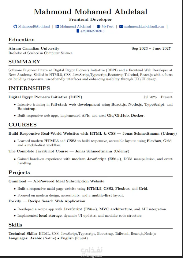 قمت بتصميم سيرة ذاتية احترافية بتنسيق عصري ومنظم يبرز المهارات والخبرة والتعليم بشكل واضح. اعتمدت على أسلوب تصميم بسيط وواضح يحقق التوازن بين الجمال والوضوح ويعكس هوية شخصية قوية.