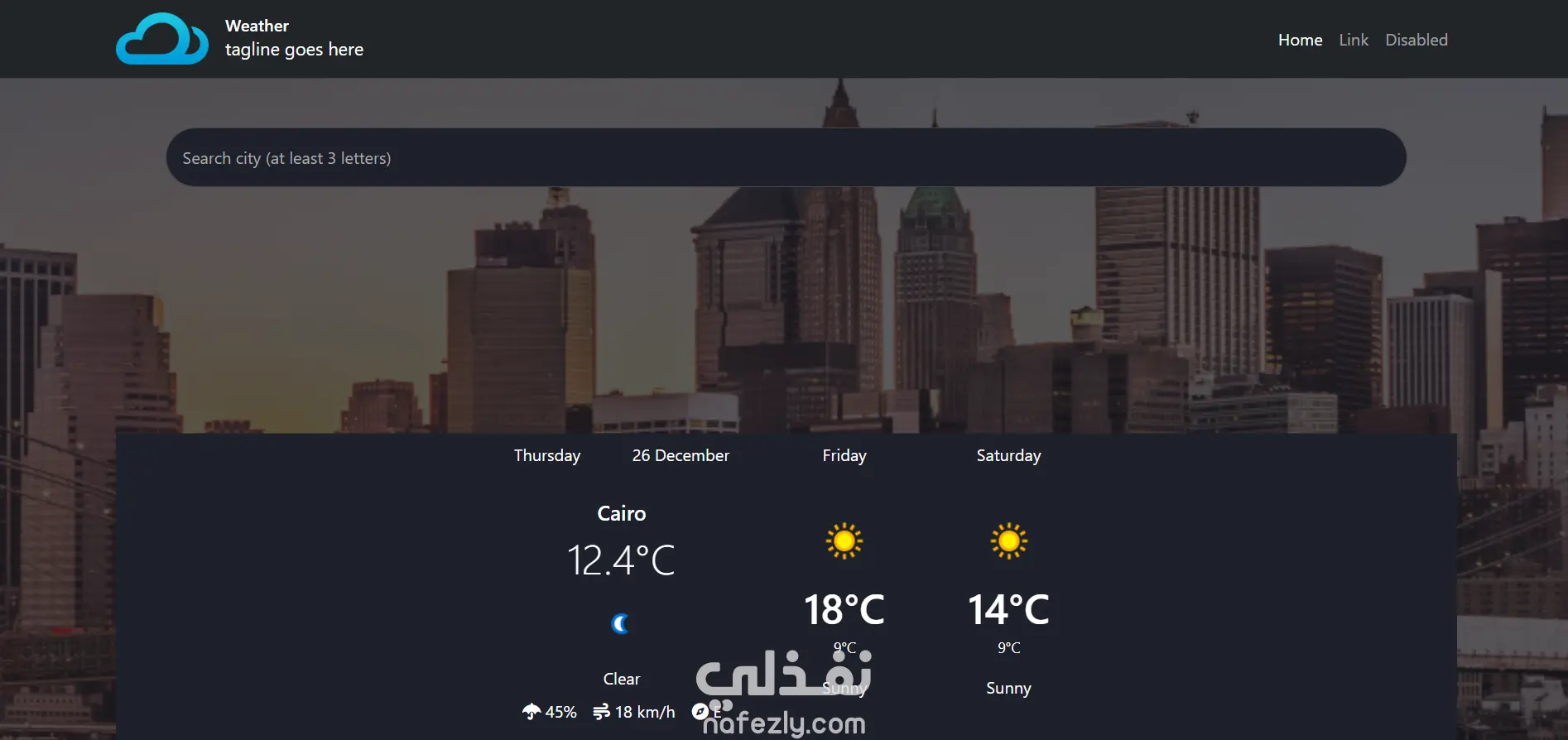 تطبيق ويب بسيط وتفاعلي يتيح للمستخدم معرفة حالة الطقس في أي مدينة حول العالم مع عرض بيانات دقيقة في واجهة سهلة الاستخدام. التقنيات المستخدمة: HTML5 CSS3 JavaScript (Vanilla JS) OpenWeather API لجلب بيانات الطقس الحقيقية مميزات المشروع: إمكانية البحث عن حالة الطقس لأي مدينة عرض درجة الحرارة، نسبة الرطوبة، وسرعة الرياح جلب البيانات مباشرة من الـ API باستخدام Fetch تصميم متجاوب (Responsive) يعمل على جميع الأجهزة تحديث البيانات في نفس الصفحة بدون إعادة تحميل