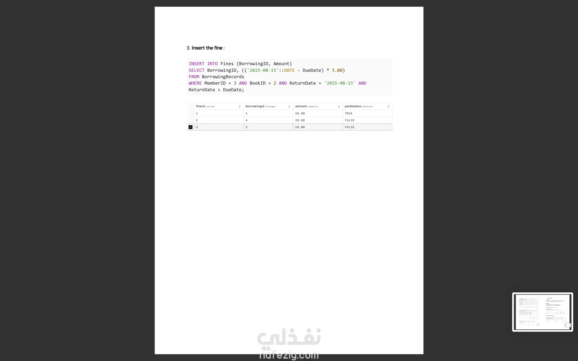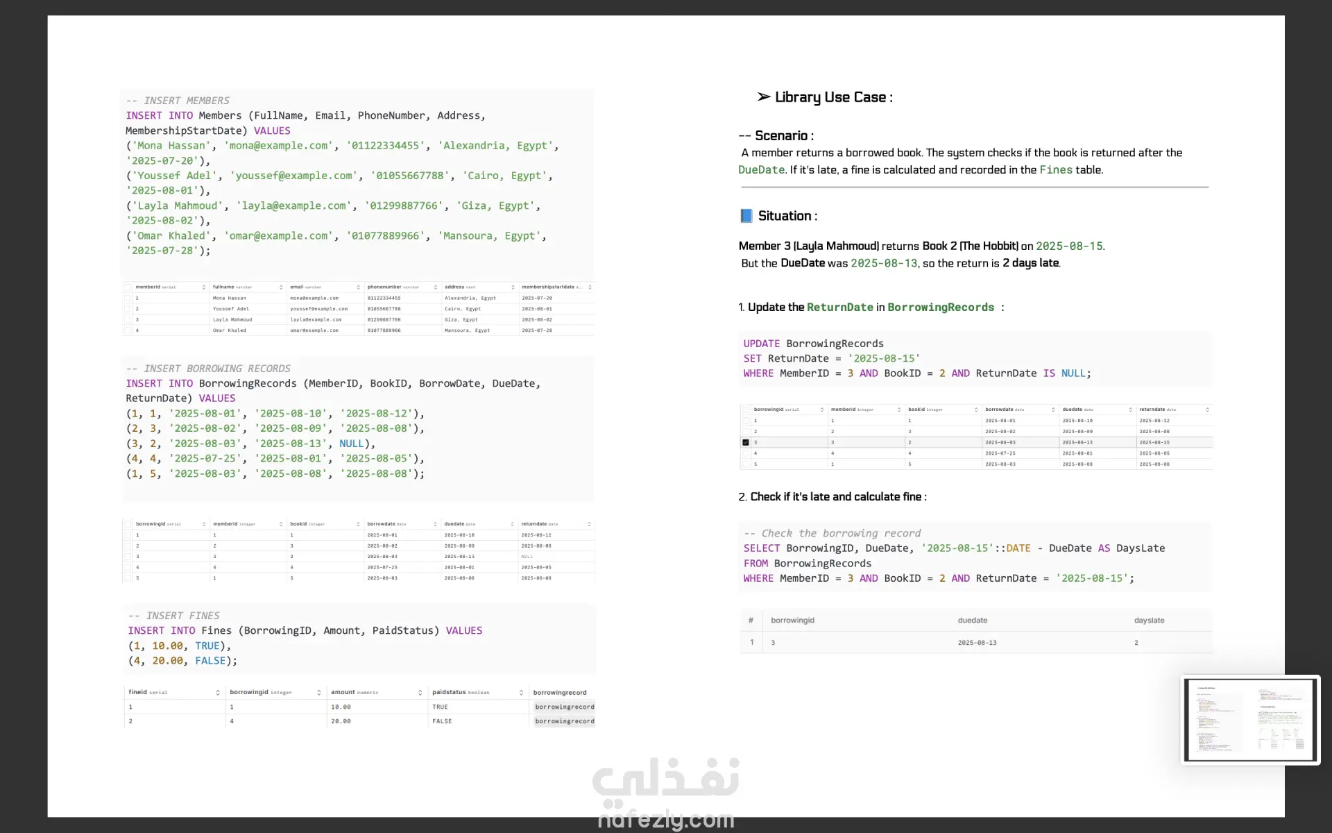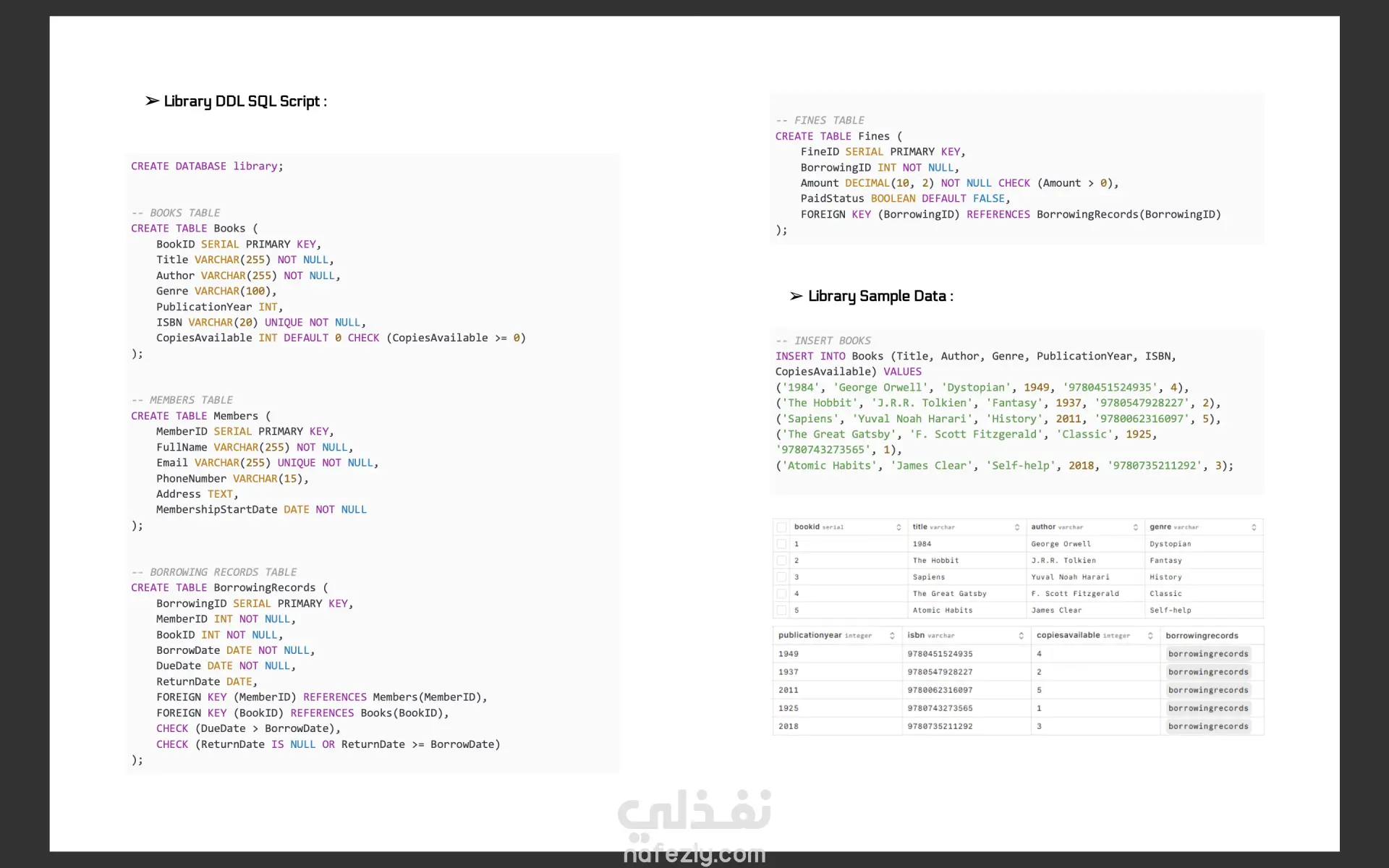 In this project, I created and designed a complete database system for a Library Management System. The work included: Building core tables: Books, Members, Borrowing Records, and Fines, with constraints such as primary and foreign keys to ensure data integrity and consistency. Inserting sample data to simulate real-world cases (e.g., adding popular books, members, and borrowing transactions). Implementing a practical use case where a member returns a book after the due date; the system updates the return date, checks for delays, calculates the fine automatically, and records it in the Fines table. This project demonstrates my skills in: Database design and modeling. Writing DDL and DML SQL queries. Managing table relationships and constraints. Simulating real-world scenarios for efficient library management