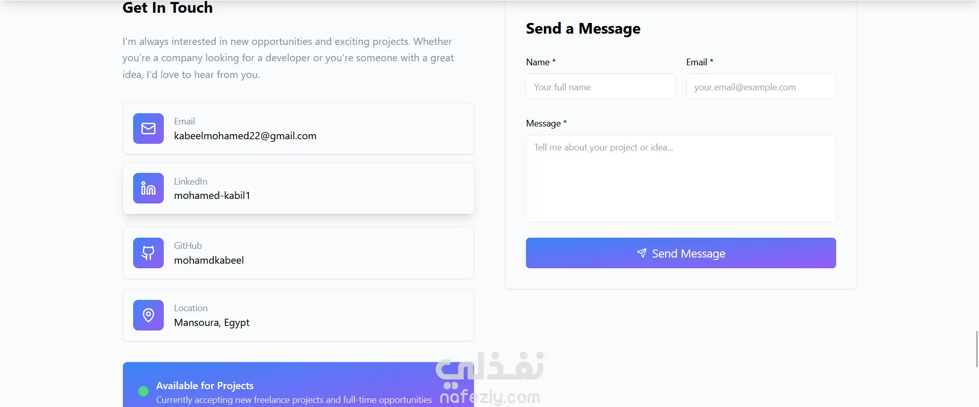 قمت بتطوير بورتفوليو شخصي متكامل لعرض مشاريعي وأعمالي السابقة في مجال تطوير الواجهات الأمامية. الموقع يتميز بـ: تصميم عصري متجاوب يعمل على جميع الأجهزة (موبايل – تابلت – كمبيوتر). أقسام منظمة: (عنّي، المشاريع، المهارات، وسائل التواصل). واجهة مستخدم سلسة مع أنيميشن بسيط لزيادة التفاعل. سرعة وأداء عالي مع كود نظيف وقابل للتطوير. تم تنفيذ المشروع باستخدام أحدث التقنيات في تطوير الويب لضمان أفضل تجربة للمستخدم