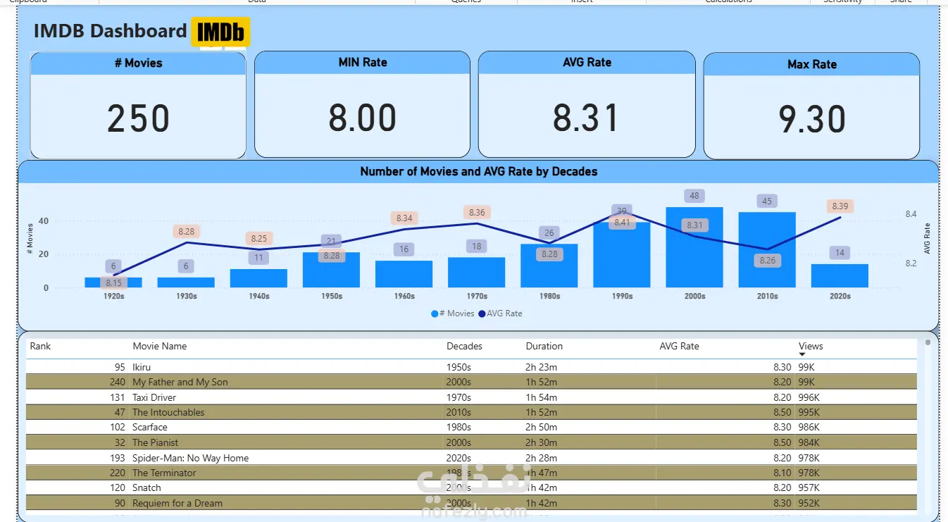 في هذا المشروع قمت بإنشاء لوحة معلومات تفاعلية (Dashboard) باستخدام Power BI لتحليل بيانات موقع IMDb، والهدف منها هو عرض نظرة شاملة حول الأفلام الأعلى تقييمًا عبر مختلف العقود الزمنية.