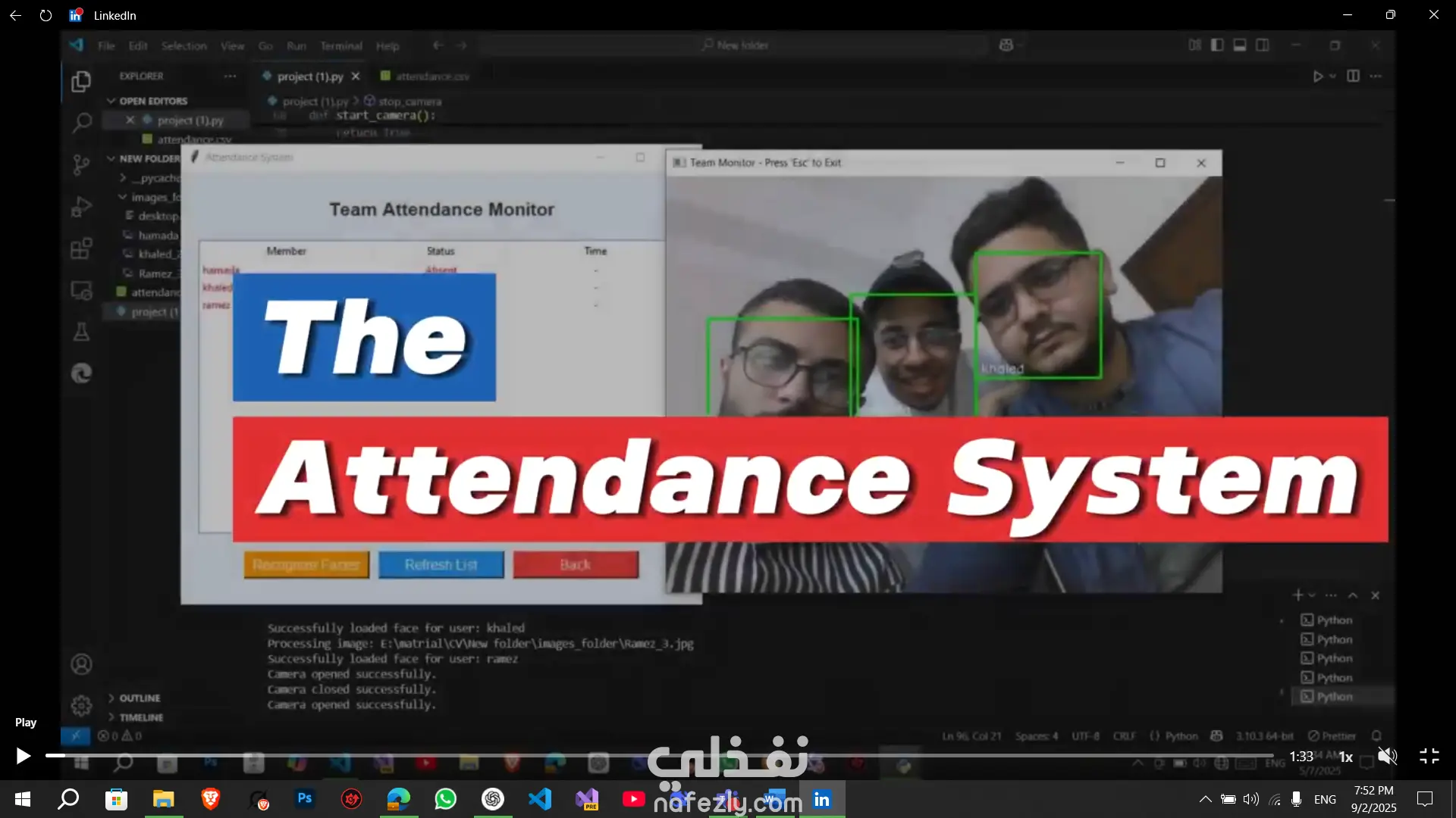 Attendance System باستخدام تقنية التعرف على الوجه قمت بتطوير نظام حضور كامل يعتمد على Face Recognition و OpenCV. النظام يقوم بـ: التعرف على الوجوه بشكل حي عبر الكاميرا. تسجيل الحضور تلقائيًا وتخزينه في ملف CSV منظم. واجهة استخدام بسيطة وسهلة مبنية بـ Tkinter. استخدام مكتبات: Python, face_recognition, OpenCV, NumPy, Pandas. النتيجة: نظام عملي يساعد على أتمتة تسجيل الحضور بدقة وسهولة.