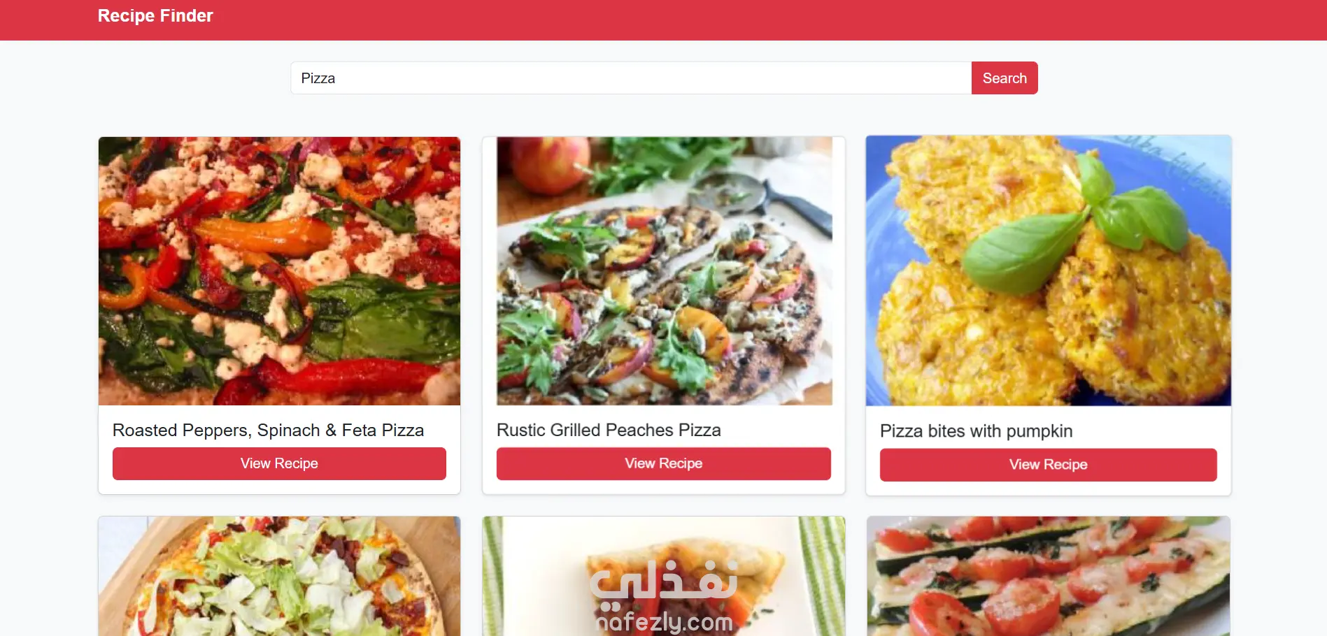 تطبيق يسمح للمستخدم بالبحث عن وصفات طعام متنوعة. يقوم التطبيق بجلب البيانات، ويعرض النتائج على شكل بطاقات تحتوي على صورة الطبق ورابط للوصفة الكاملة
