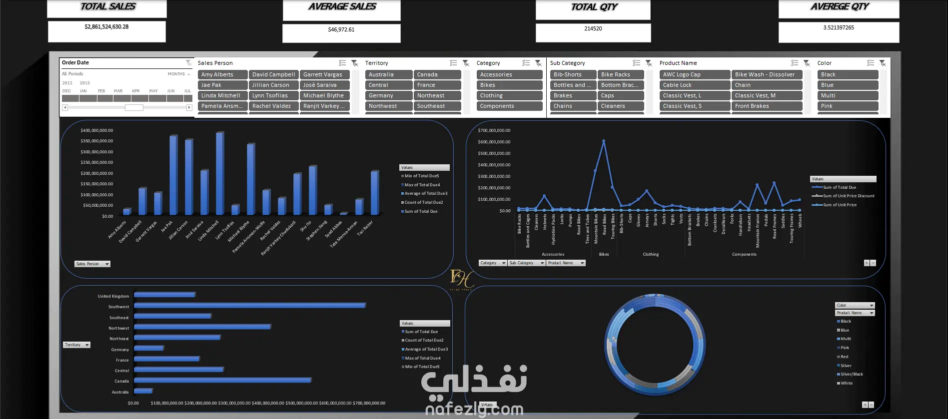 شملت قاعدة البيانات مجموعة من الحقول الرئيسية مثل: مندوب المبيعات، المنطقة، الفئة، الفئة الفرعية، اسم المنتج، اللون، كمية الطلب، تاريخ الطلب، سعر الوحدة، الخصومات، إجمالي الصفقة، وإجمالي المبلغ المستحق. هذه البيانات كانت الأساس لإجراء تحليل شامل لأداء المبيعات.