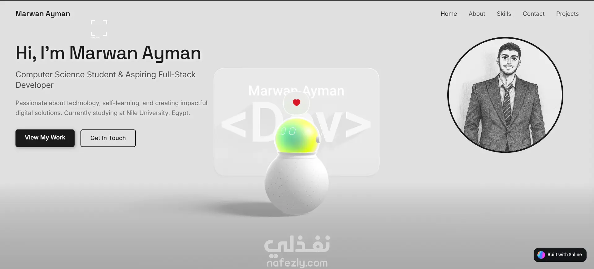 عن المشروع: موقع بورتفوليو شخصي حديث ومتحرك بيعرض معلوماتي، مهاراتي، وأعمالي كمطوّر ويب وتطبيقات موبايل. الهدف إنه يكون واجهة احترافية تعكس شخصيتي وخبرتي ويجمع كل التفاصيل (CV – Skills – Projects – Contact) في مكان واحد بتجربة سلسة وجذابة. الأدوات المستخدمة: HTML5 – CSS3 – JavaScript – Spline 3D – GitHub Pages / Netlify للنشر. خطوات التنفيذ: تصميم واجهة مستخدم عصرية مع تنقل سلس بين الصفحات (Home – About – Skills – Projects – Contact). دمج عناصر 3D تفاعلية باستخدام Spline لزيادة جاذبية العرض. إنشاء أقسام تفصيلية: نبذة شخصية، التعليم، المهارات، المشاريع، وسائل التواصل. ربط الموقع بملفات خارجية (CV – GitHub – LinkedIn). نشر الموقع أونلاين ليكون متاح للجميع بسهولة. النتائج: بورتفوليو ديناميكي واحترافي بيعكس هويتي التقنية، بيساعد أصحاب الأعمال أو العملاء يشوفوا شغلي وخبرتي بشكل بسيط وواضح. الموقع سريع، متجاوب مع الموبايل، وبيقدم تجربة مستخدم مريحة.