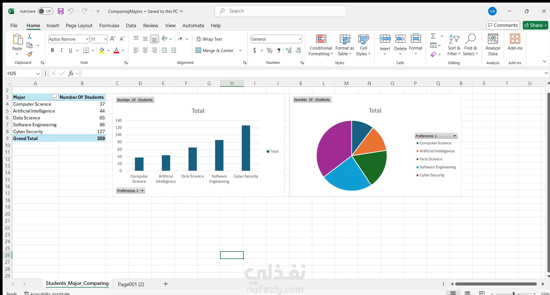 وصف المشروع: قمت بإنشاء تقرير تحليلي باستخدام Microsoft Excel لمقارنة توزيع الطلاب عبر عدة تخصصات أكاديمية، وهي: علوم الحاسب، الذكاء الاصطناعي، علم البيانات، هندسة البرمجيات، والأمن السيبراني. التقرير يتضمن: جدول منظم يوضح عدد الطلاب في كل تخصص مع الإجمالي الكلي. مخطط عمودي (Bar Chart) لمقارنة عدد الطلاب بشكل بصري بين التخصصات. مخطط دائري (Pie Chart) يوضح نسبة كل تخصص من إجمالي الطلاب. الهدف من التقرير: تقديم رؤية سريعة ومرئية حول مدى إقبال الطلاب على التخصصات المختلفة، مما يساعد الإدارات الأكاديمية على اتخاذ قرارات أفضل تتعلق بتوزيع الموارد أو فتح برامج جديدة. الأدوات المستخدمة: Microsoft Excel جداول Pivot Tables (للتحليل) الرسوم البيانية (Bar Chart & Pie Chart)