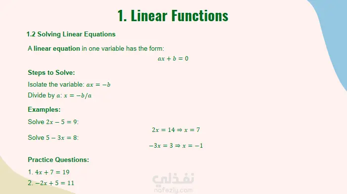 الهدف: إنشاء مجموعة شاملة من شروحات بوربوينت لمادة IGCSE Mathematics Paper 1 (P1)، تغطي التسعة دروس بالكامل بطريقة منظمة، واضحة، وجذابة بصريًا. تهدف هذه الشروحات إلى مساعدة الطلاب على فهم المفاهيم، حل التمارين، ومتابعة الحلول خطوة بخطوة. محتوى الدروس: الدرس 1: الدوال الخطية تقييم الدوال حل المعادلات الخطية رسم الخطوط مع الميل والنقطة المقطعية أمثلة محلولة الدرس 2: التكامل (Integration) التكامل غير المحدد التكامل المحدد التطبيقات العملية (مساحة تحت المنحنى، المسافة من السرعة، حجم الأجسام) تمارين محلولة الدرس 3: المعادلات التربيعية طريقة التحليل صيغة المعادلة التربيعية العلاقة بين جذور المعادلة ومعاملاتها أمثلة وتمارين الدرس 4: العلاقات المثلثية العلاقات الأساسية (مثل: sin²θ + cos²θ = 1) تبسيط التعابير تمارين تطبيقية الدرس 5: المعادلات المثلثية حل معادلات الجيب، جيب التمام، الظل حدود المجال أمثلة محلولة الدرس 6: المتتاليات والمتسلسلات المتتاليات الحسابية المتتاليات الهندسية صيغ مجموع العناصر تمارين تطبيقية الدرس 7: التفاضل قاعدة القوة، قاعدة الضرب حساب الميل والمماس أمثلة وتمارين الدرس 8: الهندسة التحليلية الميل، نقاط تقاطع الخطوط صيغ المسافة ونقطة المنتصف تمارين على الرسم البياني الدرس 9: الاحتمالات الأحداث الفردية والمتعددة أساسيات التوافيق أمثلة وتمارين المخرجات / Deliverables: شرائح بوربوينت: كل درس يتم عرضه في 10–20 شريحة تقريبًا حسب حجم المحتوى منظم بصريًا مع مخططات، جداول، رسوم بيانية عرض خطوة بخطوة للحلول تمارين عملية: أسئلة من امتحانات السنوات السابقة (2015–2025) حلول مفصلة على الشرائح أو في ملحق شرائح الملخص / Key Points: أهم القوانين والنقاط الرئيسية لكل درس محتوى اختياري: اختبارات قصيرة في نهاية كل درس عناصر تفاعلية (مثل الرسوم المتحركة لإظهار خطوات الحل) الفئة المستهدفة: الطلاب المستعدون لـ IGCSE Mathematics Paper 1 المدرسون الباحثون عن مواد تعليمية جاهزة للعرض المتعلمون الذاتيّون الراغبون في الحل خطوة بخطوة والفهم البصري الأدوات والبرمجيات: Microsoft PowerPoint (الرئيسي) Excel / أدوات الرسم البياني للتمثيلات تصدير PDF للتوزيع الفوائد: تعلم بصري وتفاعلي يغطي جميع المواضيع المهمة للورقة 1 يتضمن أسئلة سنوات سابقة مع حلول نموذجية جاهز للاستخدام في التدريس أو التعلم الذاتي