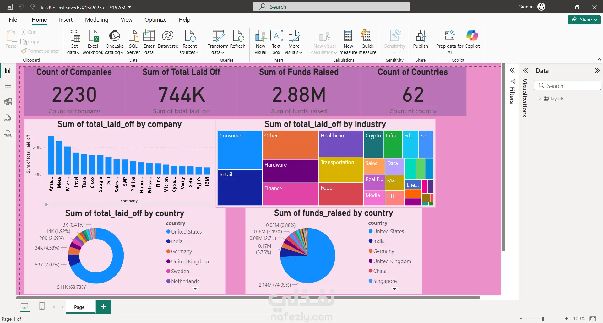 قمت بتطوير لوحة معلومات تحليلية باستخدام Power BI لعرض بيانات تسريح الموظفين عالميًا عبر الشركات والدول المختلفة.