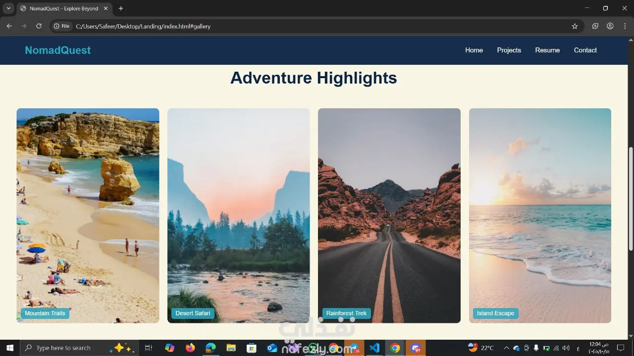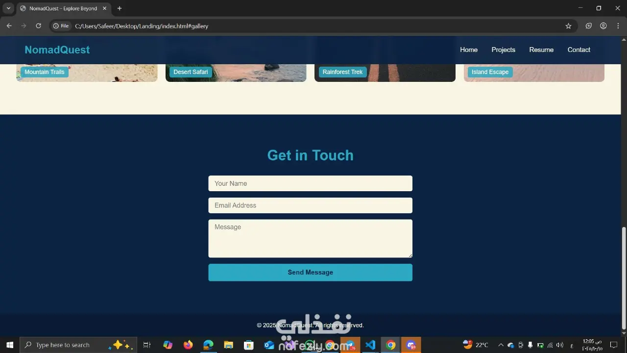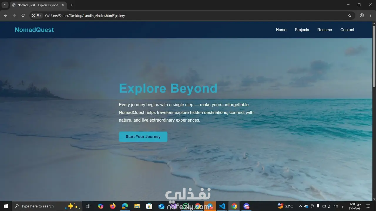 NomadQuest هي صفحة هبوط (Landing Page) صممتها لعرض فكرة موقع رحلات ومغامرات بطريقة عصرية وهادئة.