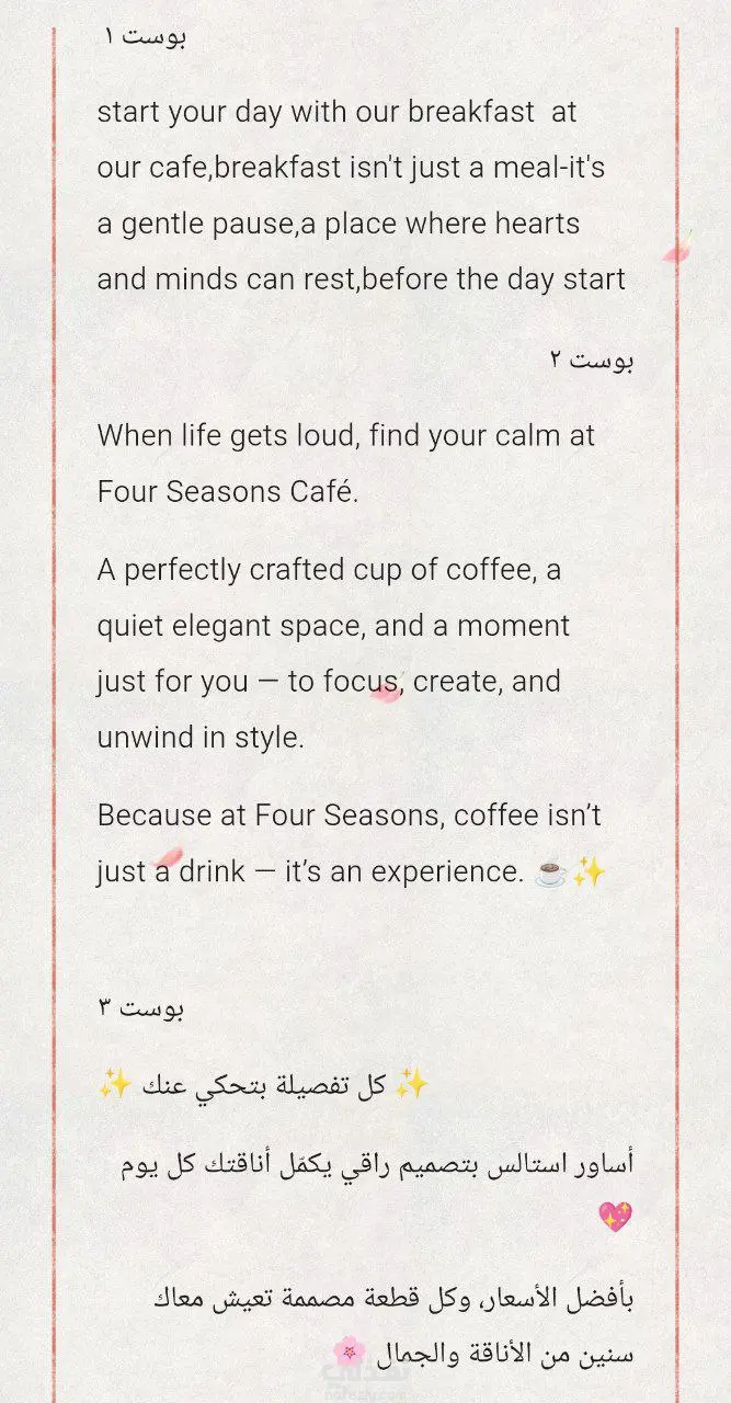 كتابة بوستات للسوشيال ميديا. كتابة محتوى صفحات مواقع. كتابة وصف منتجات أو خدمات. إعداد خطة محتوى بسيطة تناسب المجال. الخدمة مناسبة للمشاريع الصغيرة والمتوسطة وأصحاب البراندات اللي عايزين محتوى مميز وجذاب يعبر عنهم.