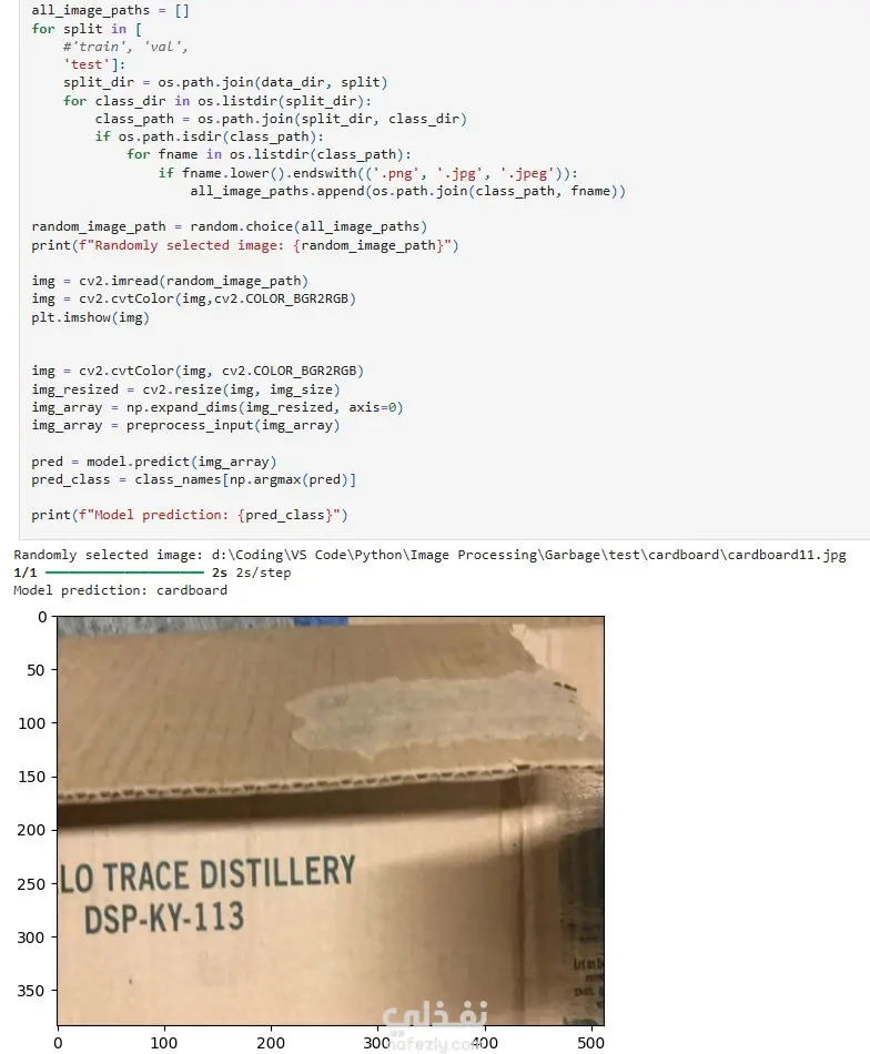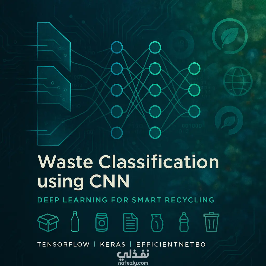 مشروع برمجي يعتمد على تقنيات التعلم العميق (Deep Learning) لتصنيف صور النفايات بشكل تلقائي باستخدام الشبكات العصبية الالتفافية (CNN)، مع الاستفادة من نموذج EfficientNetB0 عبر أسلوب التعلم بالنقل (Transfer Learning). يهدف المشروع إلى تحسين عمليات إدارة النفايات من خلال تمكين الأنظمة الذكية من التعرّف على أنواع المواد مثل الورق والبلاستيك والمعادن والزجاج بدقة عالية. تم بناء النموذج باستخدام TensorFlow وKeras مع تطبيق استراتيجيات مثل تحسين الصور (Augmentation) وإيقاف التدريب المبكر (Early Stopping) لضمان أفضل أداء ممكن. يمكن استخدام المشروع في التطبيقات البيئية، وأنظمة الفرز الذكية، والمشروعات التعليمية الخاصة بالتعلم الآلي والرؤية الحاسوبية