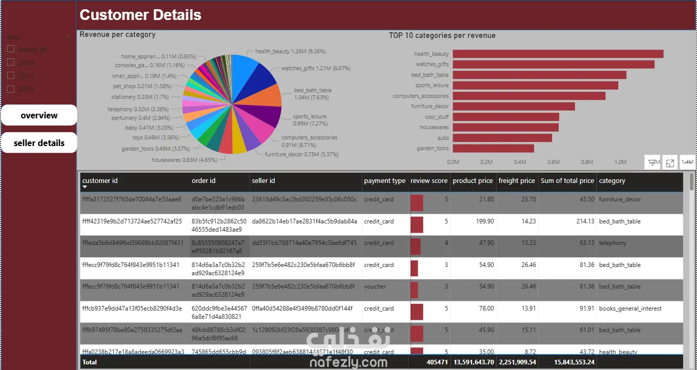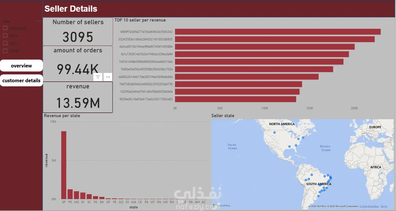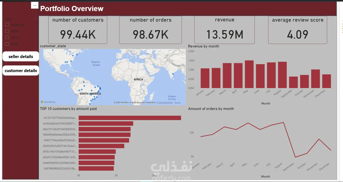 Project Summary Interactive Power BI dashboard for e-comm platform: analyzes 99.44K customers, 98.67K orders, $13.59M revenue (avg review 4.09). Slicers (year/state); pie for revenue by category (health_beauty: 9% at $1.26M); bars for top 10 categories/customers/sellers; monthly revenue bar & orders line; Brazil state maps/bars for seller revenue (SP leads); order details table w/ payments/reviews. Impact 35% quicker insights, pinpointed top categories (30% growth in health_beauty), optimized seller strategies—lifted reviews 15%.