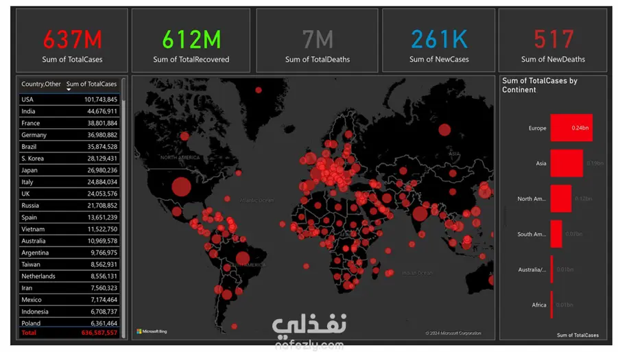 تمّ تنفيذ هذا المشروع بهدف تحليل وعرض البيانات العالمية المتعلقة بانتشار فيروس كورونا بطريقة تفاعلية وواضحة.
