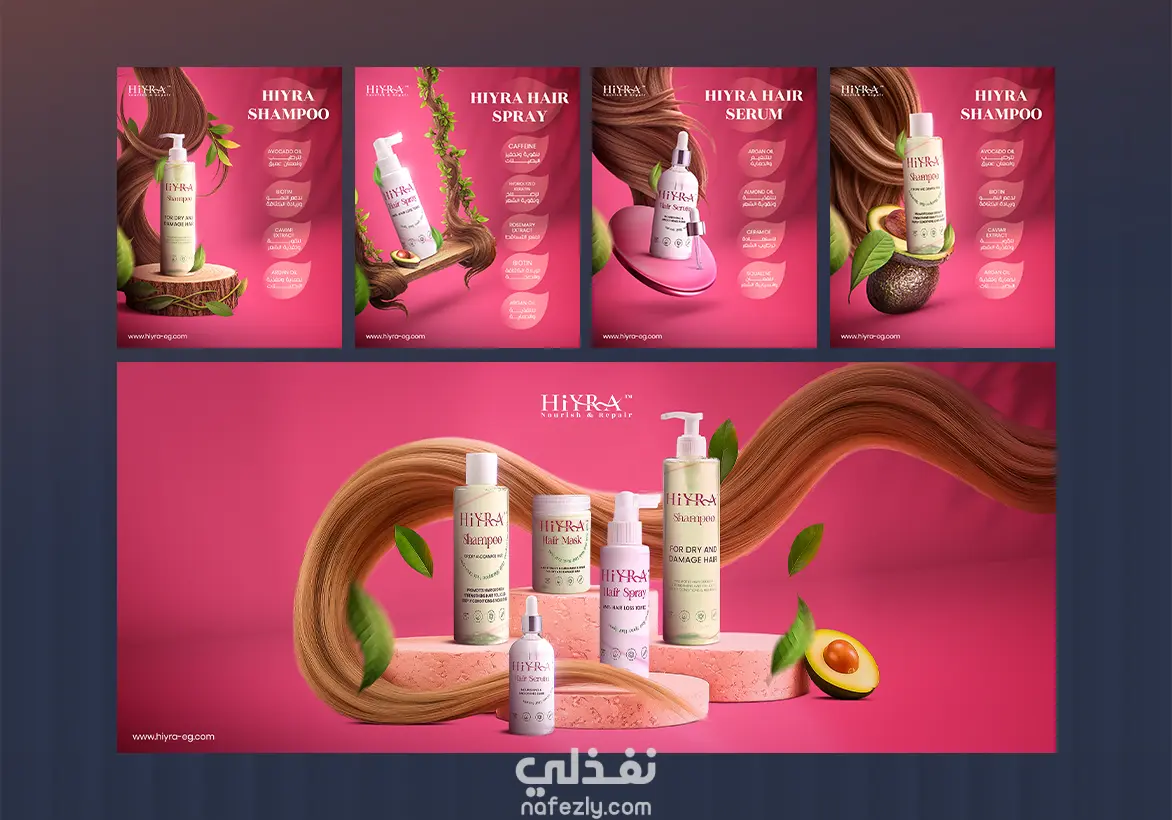 مجموعة تصاميم سوشيال ميديا لبراند يقدم منتجات العناية بالشعر وقمت بتنفيذ هذه التصاميم باستخدام برنامج الفوتوشوب مع استخدام أدوات الــ Ai جزئياً لعمل أجزاء و عناصر من التصميم