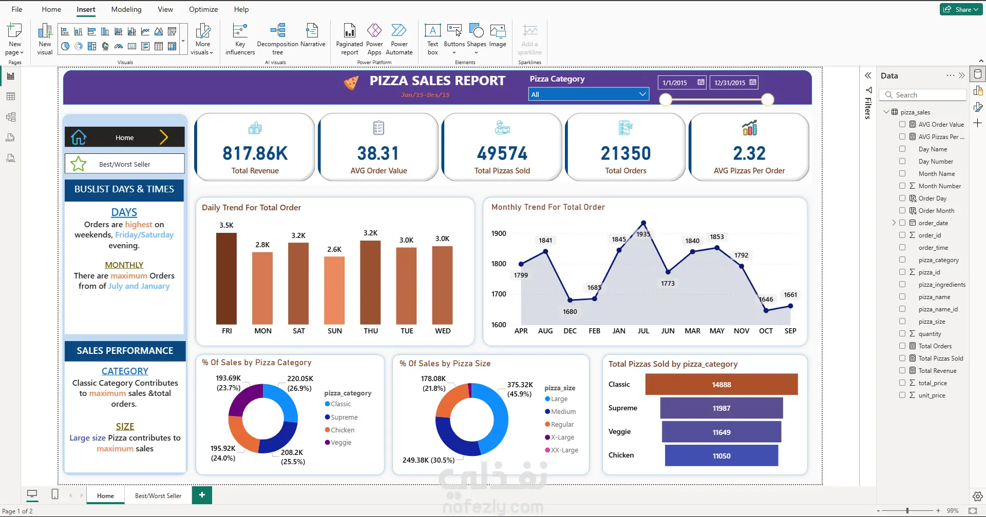 شملت مؤشرات رئيسية مثل: الإيرادات الكلية، متوسط قيمة الطلب، عدد البيتزا المباعة، عدد الطلبات ومتوسط عدد البيتزا في كل طلب.