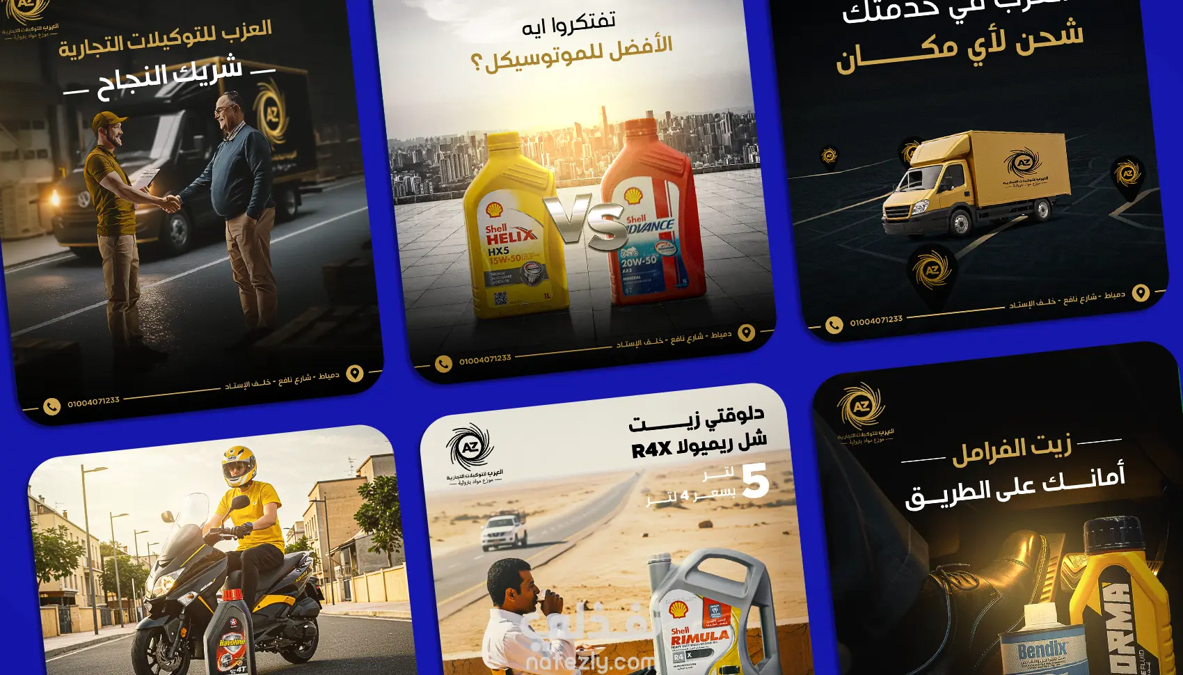 مجموعة تصاميم سوشيال ميديا لمحل بيع جملة وتجزئة لمنتجات زيوت السيارات وقمت بتنفيذ هذه التصاميم باستخدام برنامج الفوتوشوب مع استخدام أدوات الــ Ai جزئياً لعمل أجزاء و عناصر من التصميم