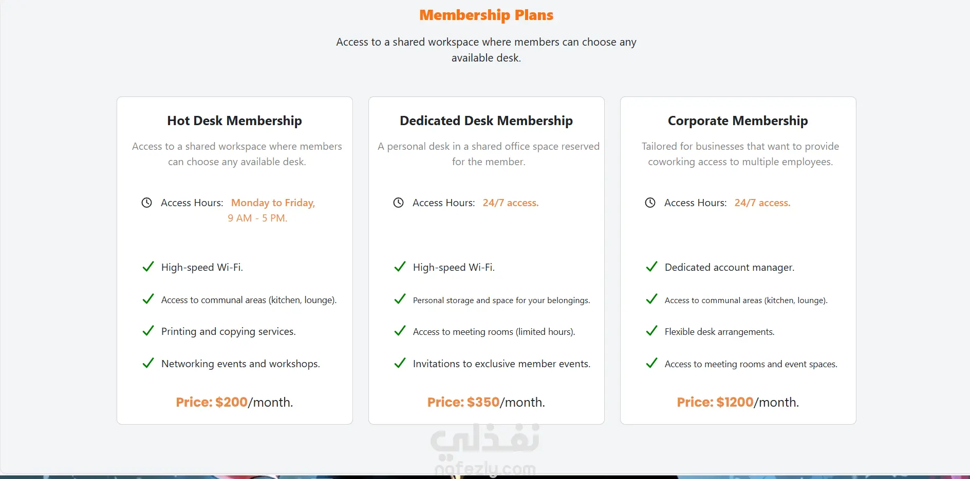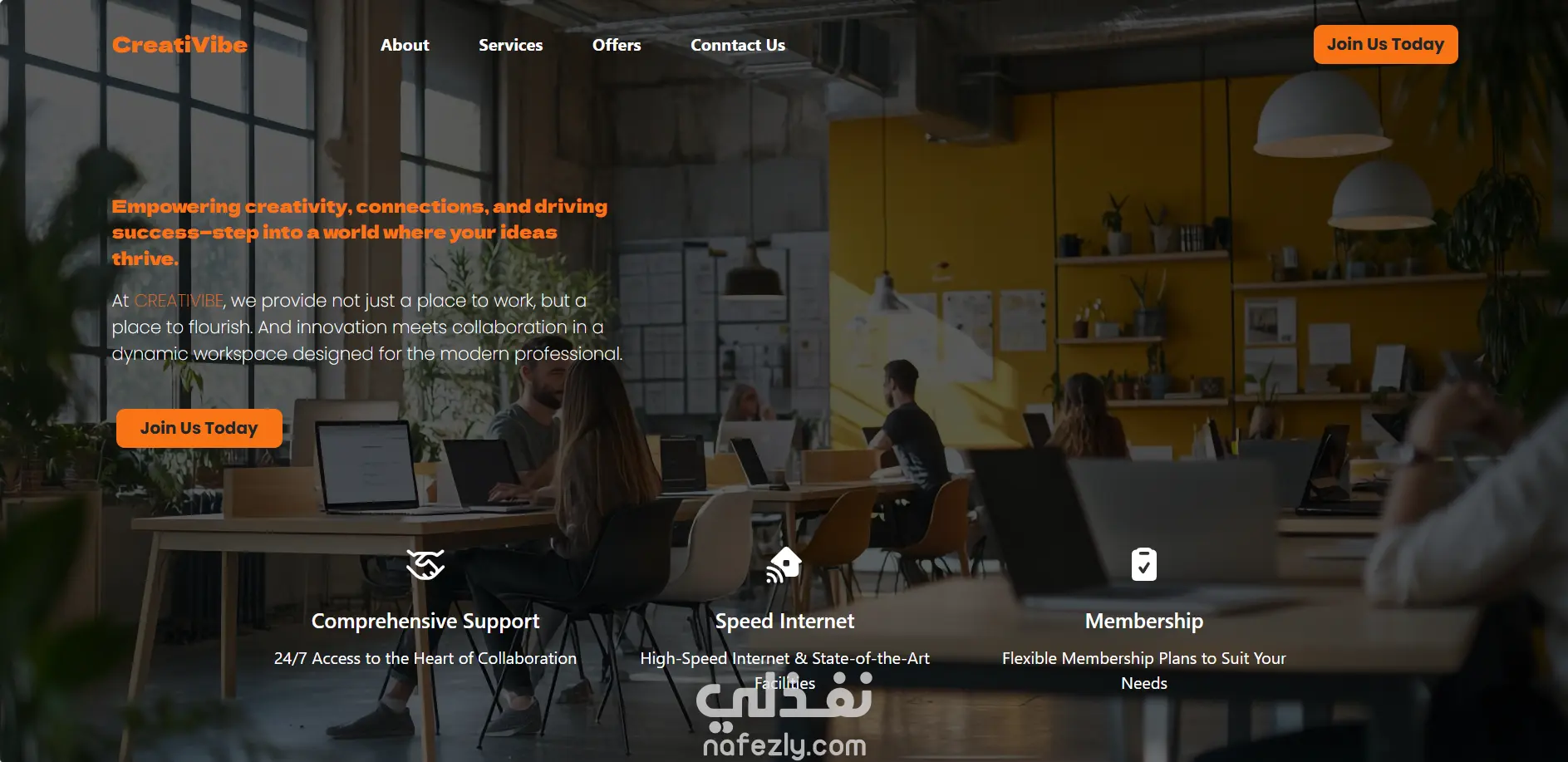 CreatiVibe هو موقع تفاعلي يقدم خدمات المساحات المشتركة (كووركينغ) مع مزايا متعددة تُمكّن المحترفين، أصحاب المشاريع الصغيرة، والشركات الناشئة من العمل في بيئة محفزة وداعمة. المنصة تعرض خطط اشتراك مرنة (مكتب ساخن، مكتب مخصص، عضوية للشركات)، مع خدمات إضافية مثل الوصول 24/7، الإنترنت فائق السرعة، الغرف المشتركة، الفعاليات، وورش العمل. المميزات والخدمات عضوية “Hot Desk” للوصول إلى مكتب مشترك خلال أوقات العمل الأساسية عضوية “Dedicated Desk” مع مساحة ثابتة ومزايا إضافية عضوية “Corporate” مصممة للشركات متعددة الموظفين خدمات إضافية: الطباعة، صالة مشتركة، تخزين شخصي، غرف اجتماعات فعاليات وورش عمل لتعزيز التواصل بين الأعضاء تصميم واجهة احترافية وتنسيق بصري لعرض الخطط والصور وبيانات التواصل التقنيات المستخدمة (توقعاتي بناءً على الموقع) HTML / CSS / JavaScript لتصميم الواجهة عرض صور ومعارض لأماكن العمل بنية صفحات: “About”، “Services”، “Offers”، “Contact Us” تهيئة للتجاوب على الأجهزة (هاتف، تابلت، سطح المكتب)