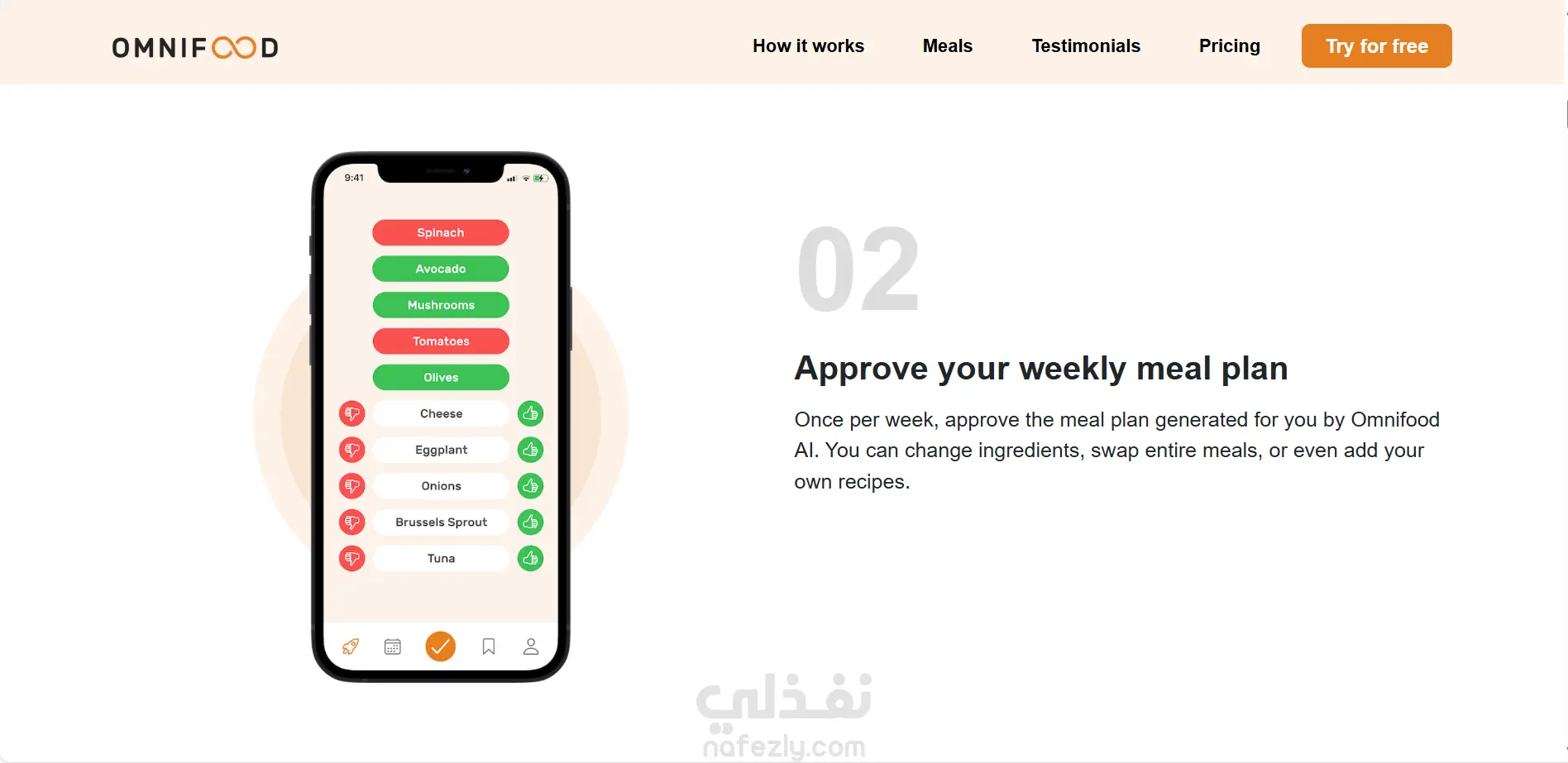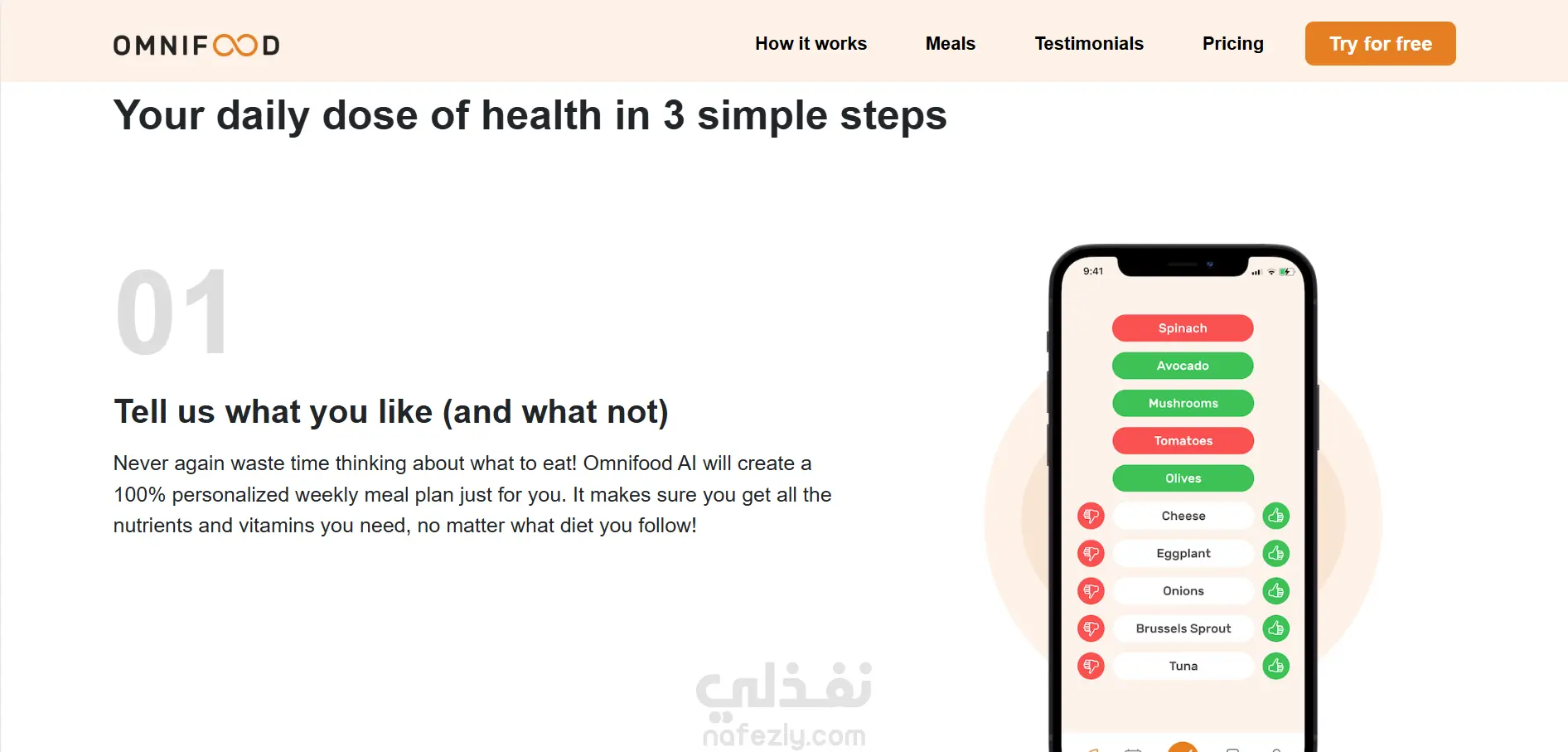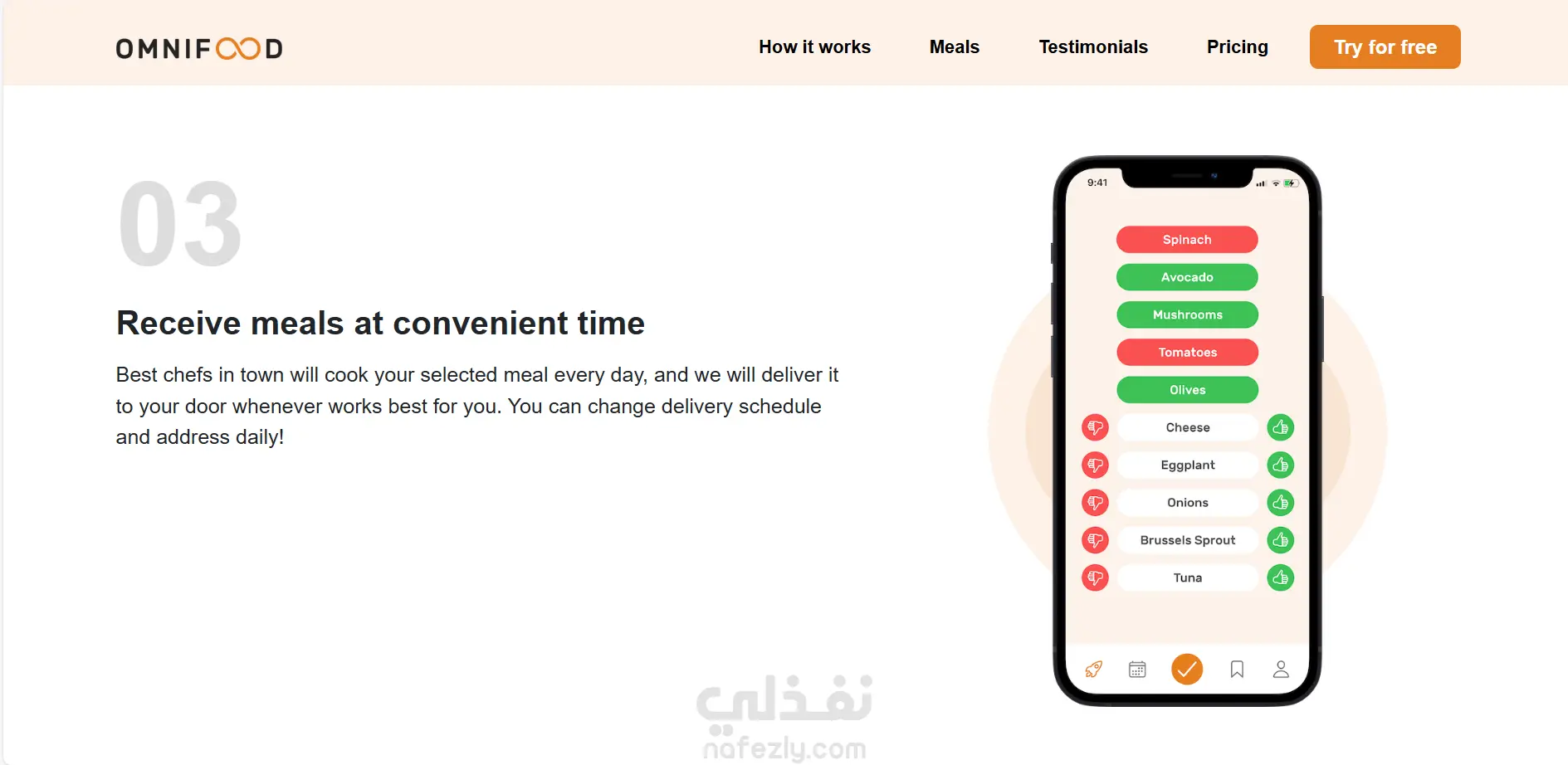 Omni-Food هو موقع ويب تسويقي لمنصة توفر خدمة توصيل وجبات صحية يومية بنظام اشتراك. المنصة تستهدف الأشخاص الراغبين في تناول وجبات متوازنة وغذائية دون الحاجة للتفكير اليومي في التخطيط أوالتسوق، حيث تقدم خططًا مخصصة حسب تفضيلات المستخدم وتسهل عملية الطلب والتوصيل. المميزات والخدمات قسم “How it works” يشرح للمستخدم خطوات الخدمة في 3 مراحل بسيطة: تحديد ما تفضّله وما ترفضه من أطعمة. الموافقة على خطة الوجبات الأسبوعية المُقترَحة مع إمكانية تعديل المكونات أو تغيير الوجبة أو إضافة وصفات خاصة. التوصيل إلى باب منزلك في الوقت المناسب لك مع مرونة في جدول التوصيل والعنوان. عرض عدد الوجبات التي تم توصيلها كإحصائية لإضفاء الموثوقية، مثلاً “250,000+ meals delivered last year!” صور وعناصر بصرية جذابة لعرض شكل الوجبات، القيمة الغذائية، الوسائل، وكيفية الاستخدام. واجهة مستخدم سهلة الاستخدام مع تنقل واضح بين الأقسام مثل “Meals”، “Pricing”، “Testimonials”. دعوة لاتخاذ إجراء (“Try for free”) لجذب المستخدم لتجربة الخدمة.