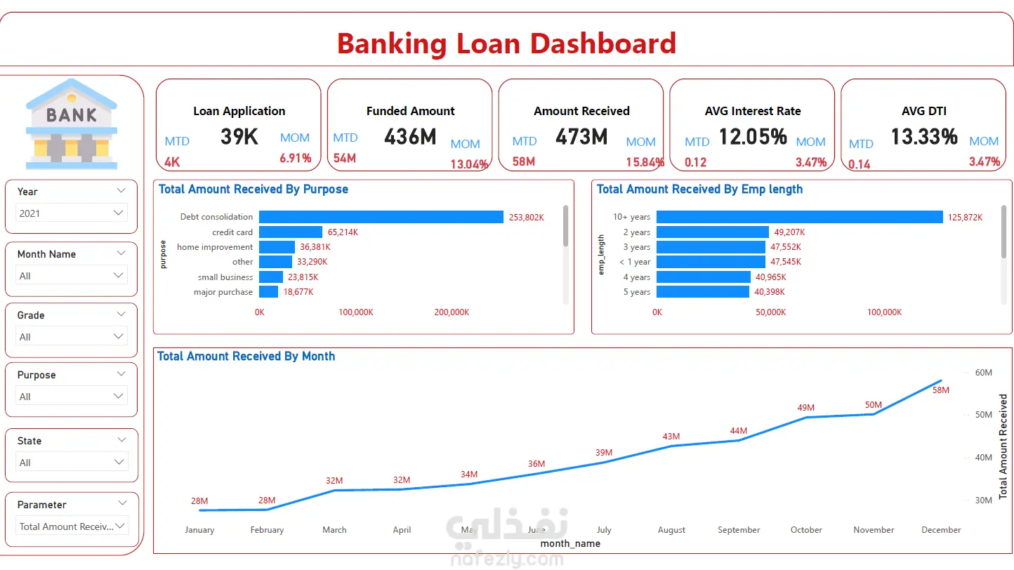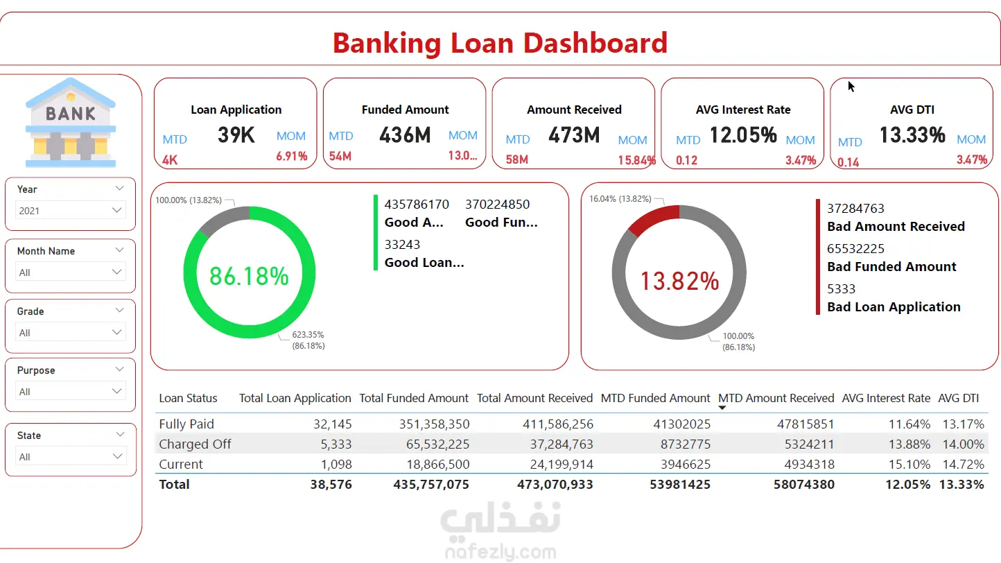 يقدم هذا المشروع لوحة معلومات Power BI التي توفر رؤى متعمقة حول أداء القروض المصرفية. وهي تتتبع المقاييس الرئيسية مثل طلبات القروض، والمبالغ الممولة، ومبالغ السداد، ومعدلات الفائدة، ونسب الدين إلى الدخل. تحلل لوحة المعلومات أيضًا الاتجاهات حسب الشهر، والغرض من القرض، ومدة التوظيف لدعم القرارات المستندة إلى البيانات.