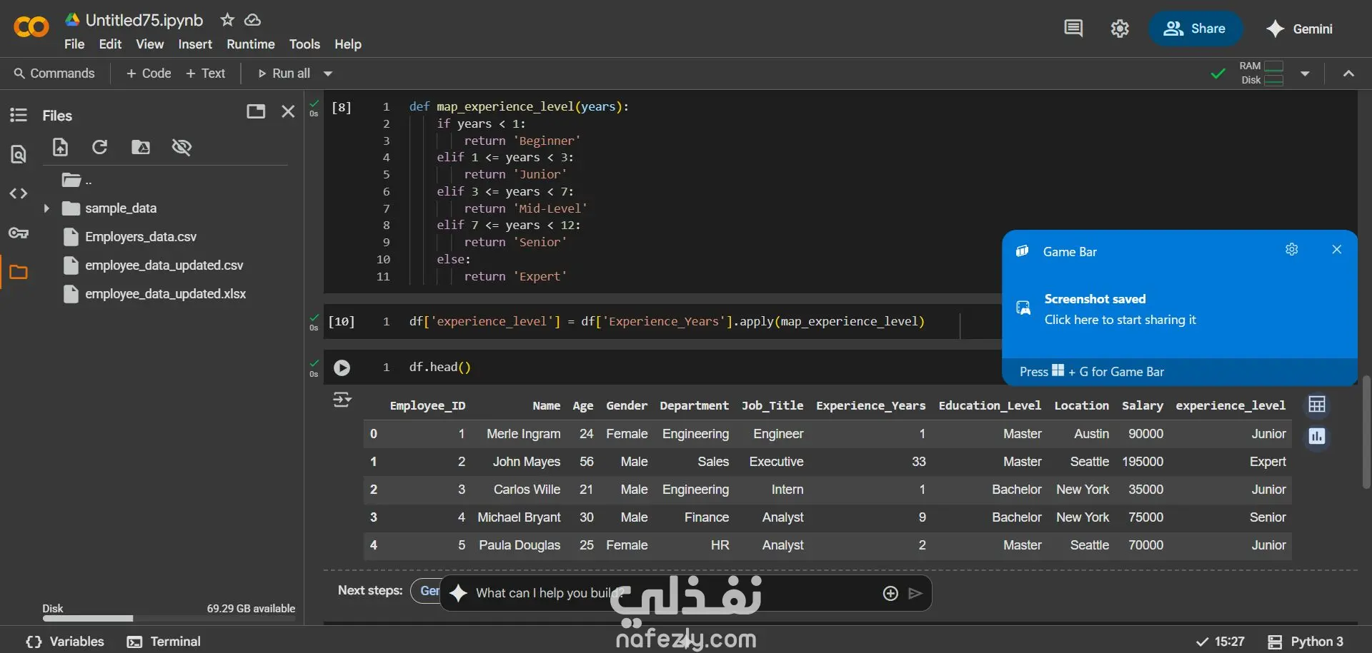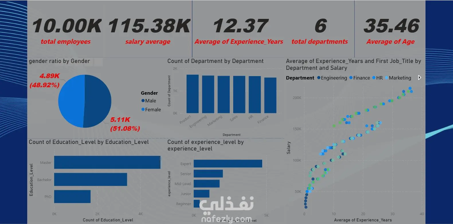 توحيد الصيغ، وإضافة عمود جديد Experience Level بناءً على سنوات الخبرة. 🔹 Data Analysis & Visualization — صممت Power BI dashboard تفاعلي يعرض الـ workforce demographics، توزيع الرواتب، وترندات الأقسام. 🔹 Key Insights — الداشبورد بيعرض gender distribution، education levels، salary by department، وكمان scatter plot يوضح العلاقة بين الخبرة والراتب عشان نقدر نكتشف الـ outliers بسهولة.