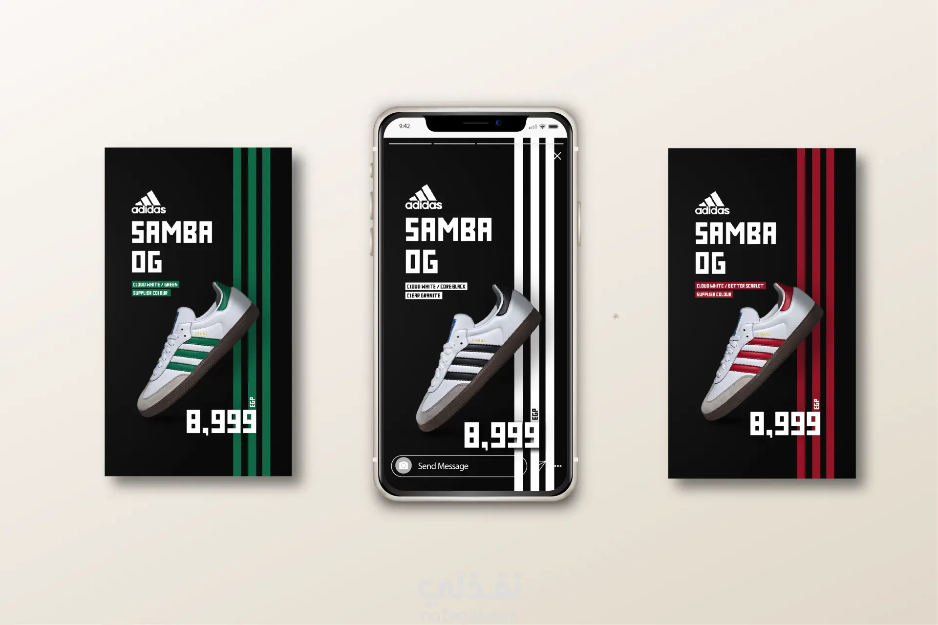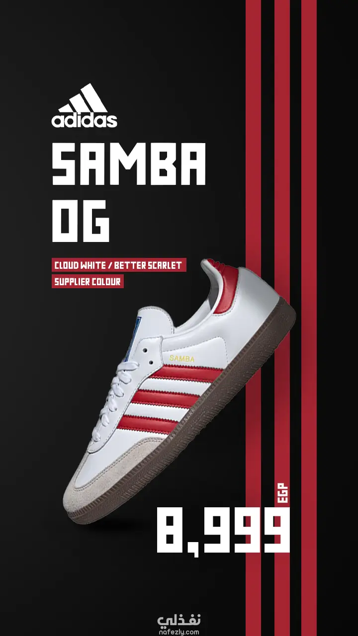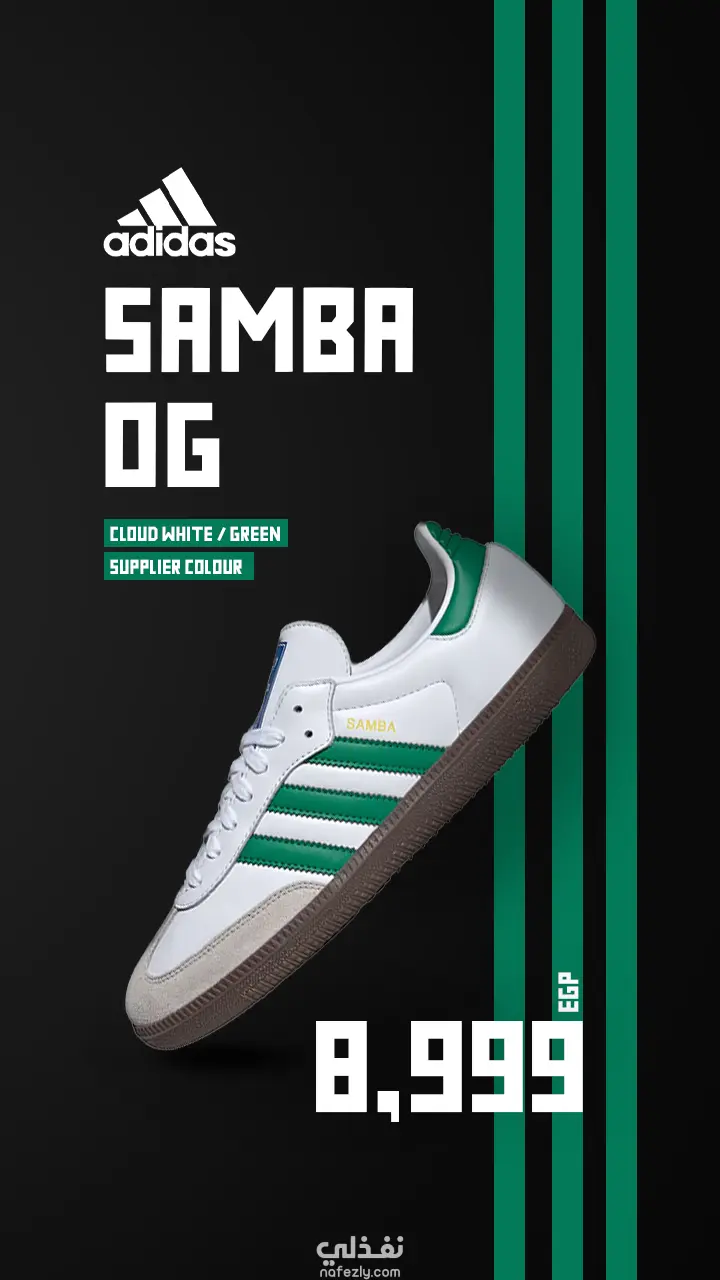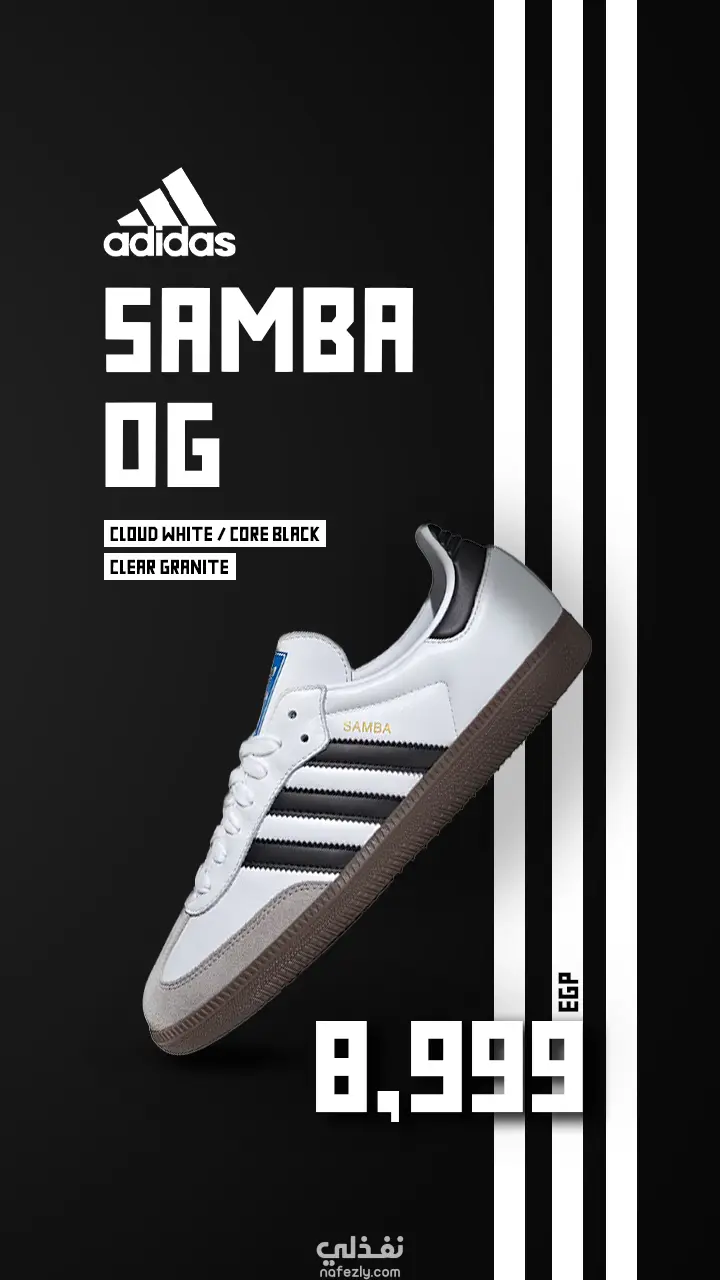 تصميم دعائي احترافي لحذاء Adidas Samba OG الكلاسيكي، يركز على إبراز هوية العلامة التجارية من خلال استخدام الألوان المميزة (الأبيض، الأسود، الرمادي).