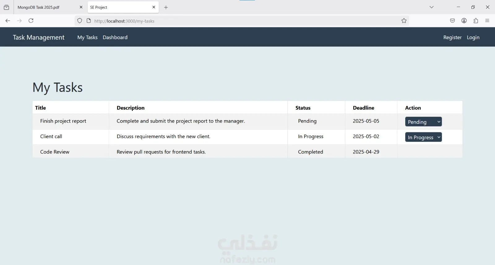 A task management application to create, assign, and track tasks with status filtering (Pending, In Progress, Completed). Tech: React, Node.js, MySQL