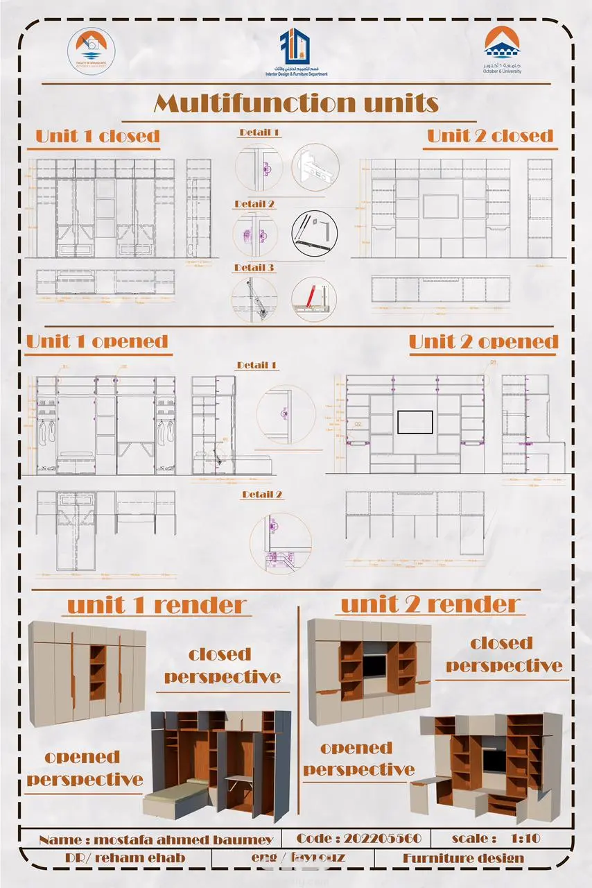 مشروع تصميم احترافي يركز على ابتكار وحدات أثاث متعددة الاستخدام تجمع بين الجمال والوظيفة في آنٍ واحد. تم العمل على تصميم قطع أثاث عملية تناسب المساحات الحديثة، بحيث يمكن استخدامها بعدة طرق دون التضحية بجانب الأناقة أو الراحة البصرية. تتضمن اللوحة: رسومات فنية تفصيلية توضح آلية الفتح والإغلاق. تفاصيل إنشائية وهندسية دقيقة توضح أسلوب التجميع والتصميم الداخلي للوحدة. مناظير ثلاثية الأبعاد واقعية تُبرز الشكل النهائي والخامات المستخدمة. من خلال هذا المشروع تم التركيز على الدمج بين التصميم الجمالي والهندسة الوظيفية، مما يعكس قدرة التصميم الداخلي على خلق حلول ذكية ومرنة تناسب مختلف الاحتياجات.