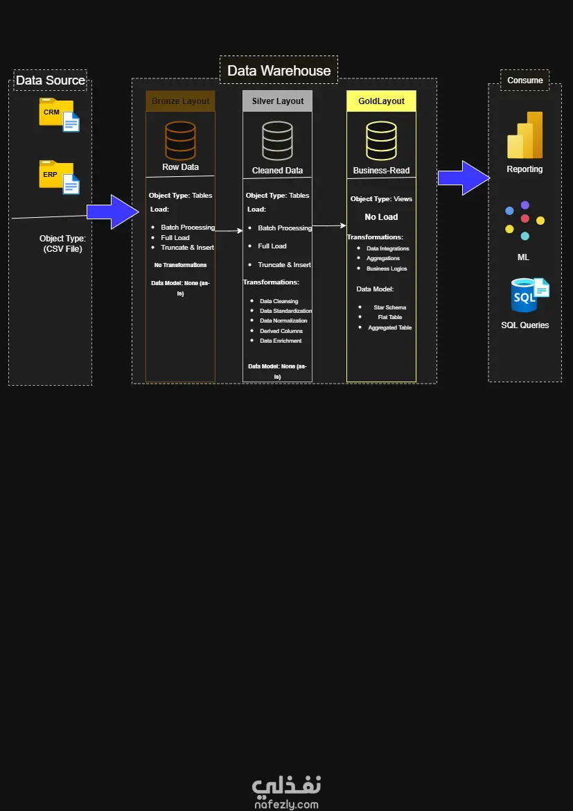 تصميم مستودع بيانات (DWH) من الصفر، يشمل تحديد الجداول، العلاقات، وطرق تخزين البيانات بطريقة منظمة تدعم تقارير الأعمال والتحليلات.