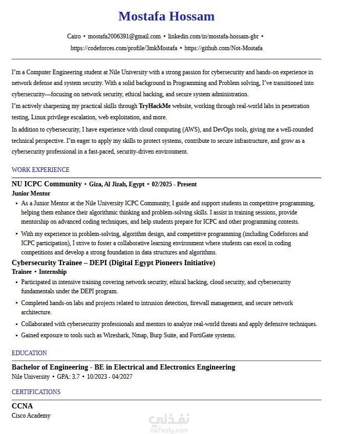 الهدف كان إنشاء CV حديث يجمع بين التصميم الجذاب والهيكل المتوافق مع خوارزميات التوظيف اللي بتستخدمها الشركات الكبرى في تصفية المتقدمين.
