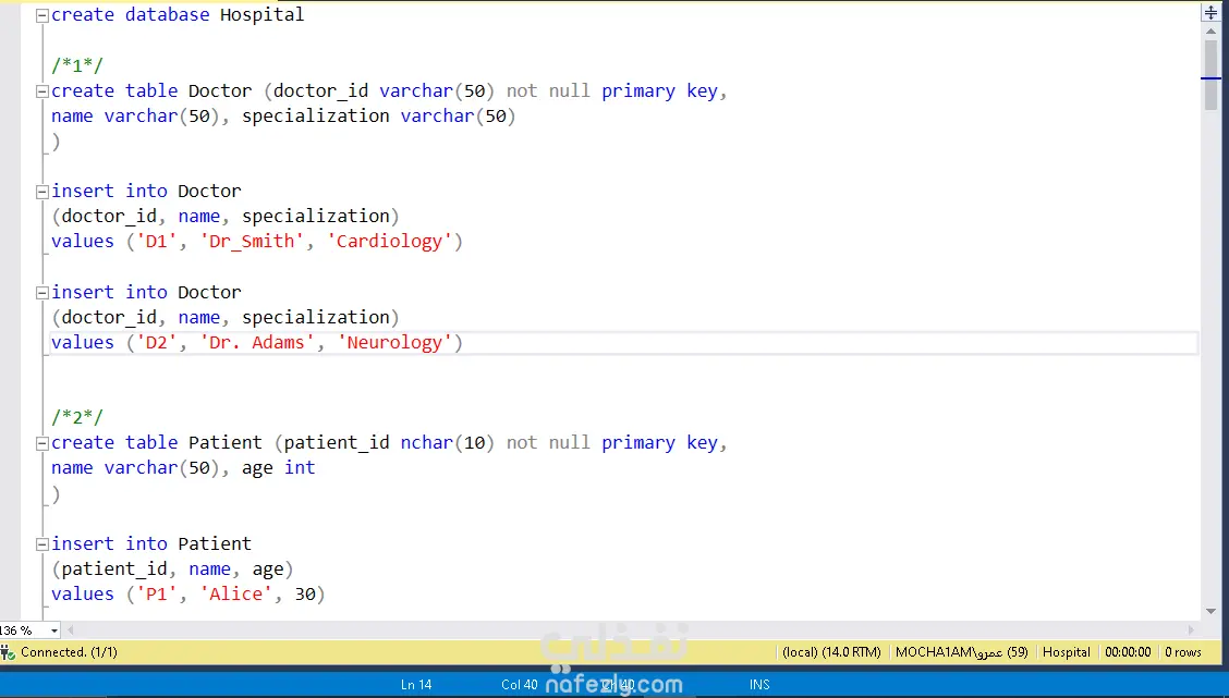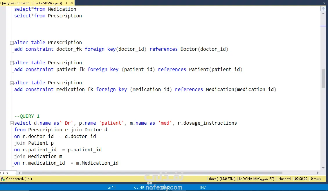 تم تصميم وتنفيذ قاعدة بيانات علائقية Relational Database باستخدام SQL لإدارة الوصفات الطبية التي تشمل الأطباء، المرضى، والأدوية. يهدف المشروع إلى تنظيم البيانات الطبية بشكل فعال وتسهيل استخراج المعلومات المهمة. المهام التي تم تنفيذها: إنشاء جداول لتمثيل العلاقات بين الأطباء، المرضى، والوصفات إدخال بيانات تجريبية باستخدام أوامر INSERT كتابة استعلامات SQL لاستخراج معلومات مثل: سجل وصفات كل مريض الأدوية الأكثر وصفًا نشاط الأطباء وتكرار وصفاتهم الأدوات المستخدمة: Microsoft SQL server قواعد البيانات العلائقية (Relational Databases) استعلامات تحليلية (SELECT, JOIN, GROUP BY, etc.) الفائدة من المشروع: تنظيم البيانات الطبية بطريقة عملية وسهلة الاستخدام تحسين القدرة على تحليل أداء الأطباء وأنماط وصف الأدوية نموذج أولي قابل للتطوير في أنظمة إدارة المستشفيات