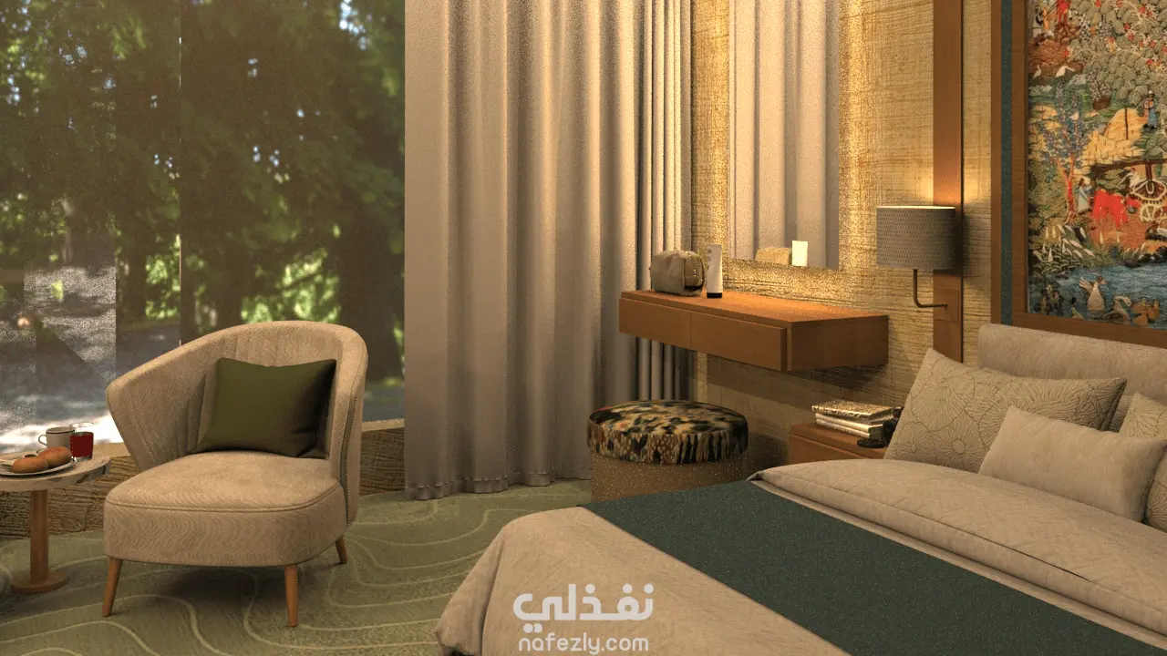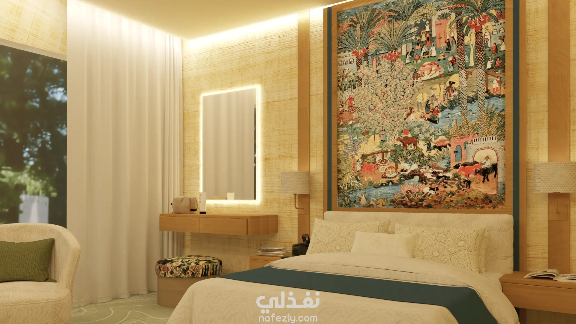 صممتُ غرفة فندقية ضمن مشروع فندق بوتيكي فاخر مستوحاة من جمال نهر النيل وروح البيئة المصرية. اعتمد التصميم على ألوان زاهية مستوحاة من طبيعة النيل وحياة ضفافه، مع دمج الأعمال الحرفية والفنية المحلية لإبراز الهوية الثقافية والفنية للمنطقة. تم اختيار الأقمشة المنسوجة يدويًا والخشب الطبيعي والقطع الفنية المحلية لخلق مساحة نابضة بالحياة تعكس تراث مصر بطريقة عصرية، مع الحفاظ على الراحة والفخامة للنزيل. يهدف التصميم إلى تقديم تجربة إقامة فريدة تدمج الأناقة الحديثة مع دعم المجتمع المحلي والفنانين والحرفيين.
