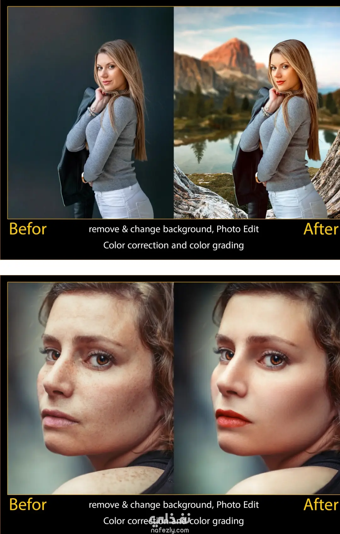 ١ـ تغيير خلفيات الصورة، مع دمج احترافي الصور مع الخلفيات ٢ـ عمل ايديت للصور بشكل احترافي بتقنيات frequency separating & dodge and burn ٣ـ تصحيح الألوان color correction ٤- Color grading