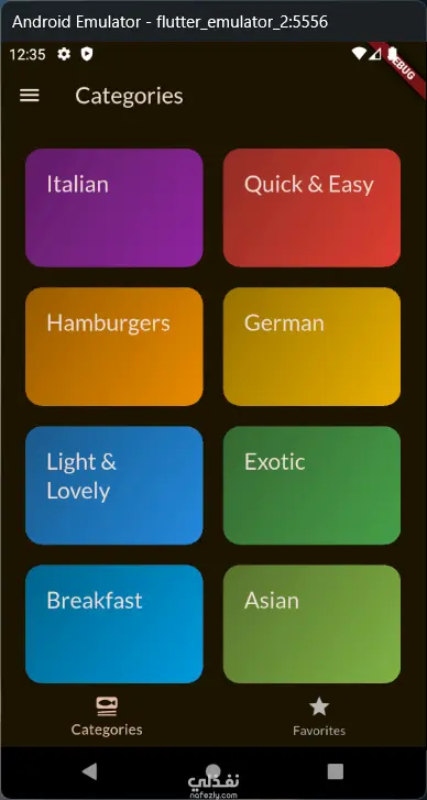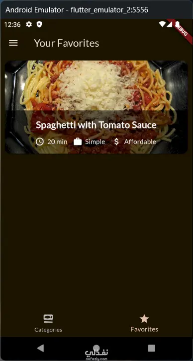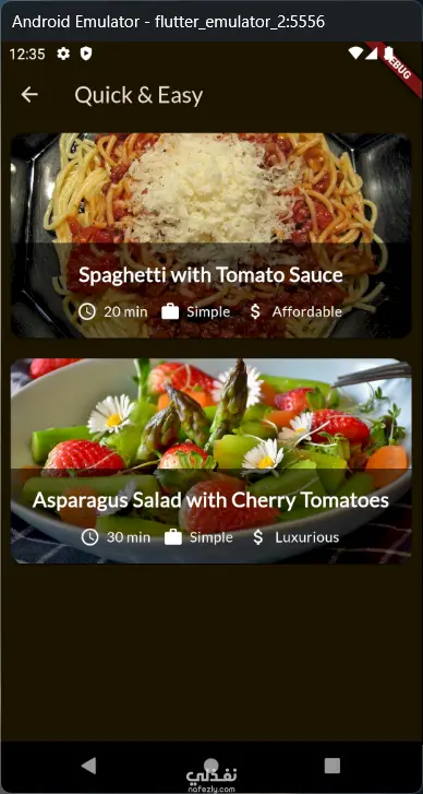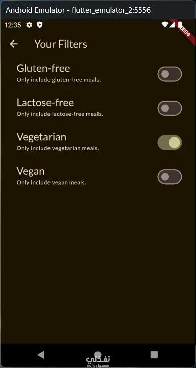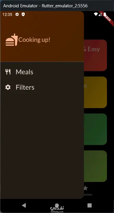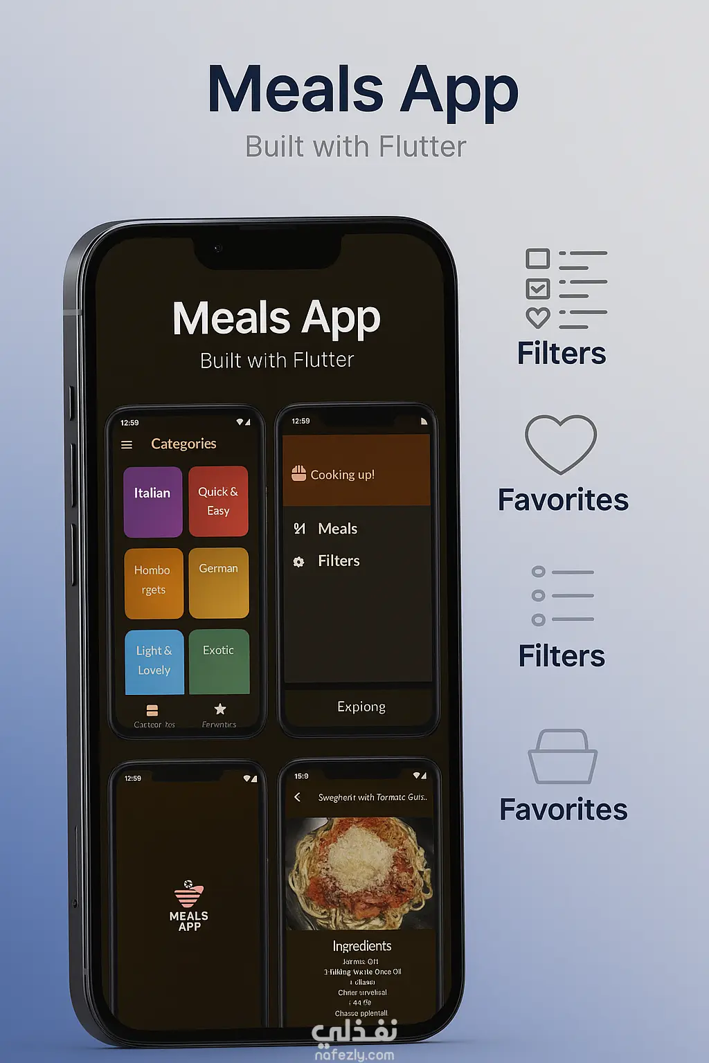 تطبيق الوجبات يتيح لك استكشاف الوجبات حسب الفئات، عرض الوصفات بالتفاصيل من مكونات وخطوات وصور، وتطبيق فلاتر مثل خالٍ من الغلوتين، خالٍ من اللاكتوز، نباتي، ونباتي صارم. كما يمكنك إضافة الوجبات إلى المفضلة والوصول إليها في شاشة مخصصة. التطبيق يتميز بتصميم داكن وعصري