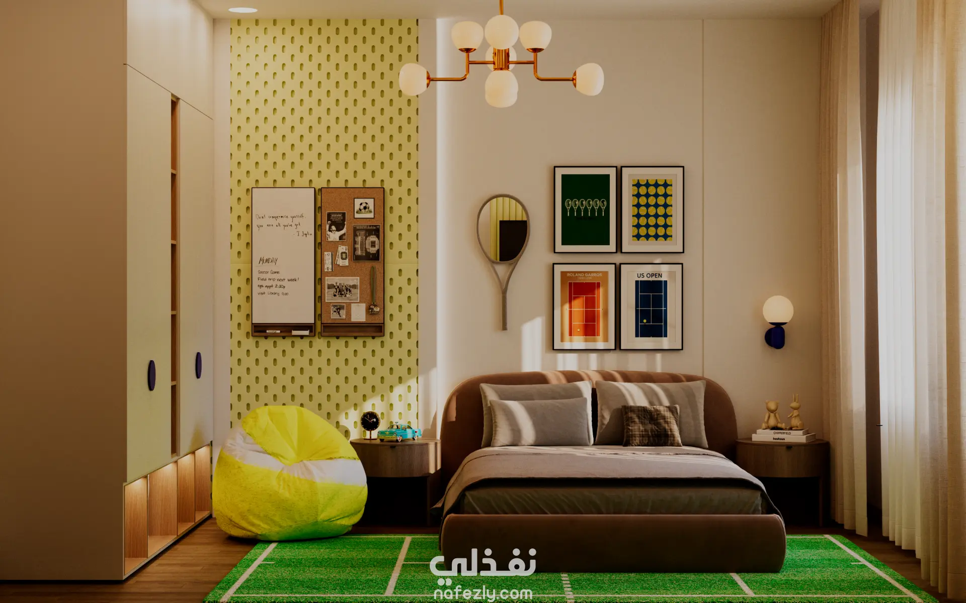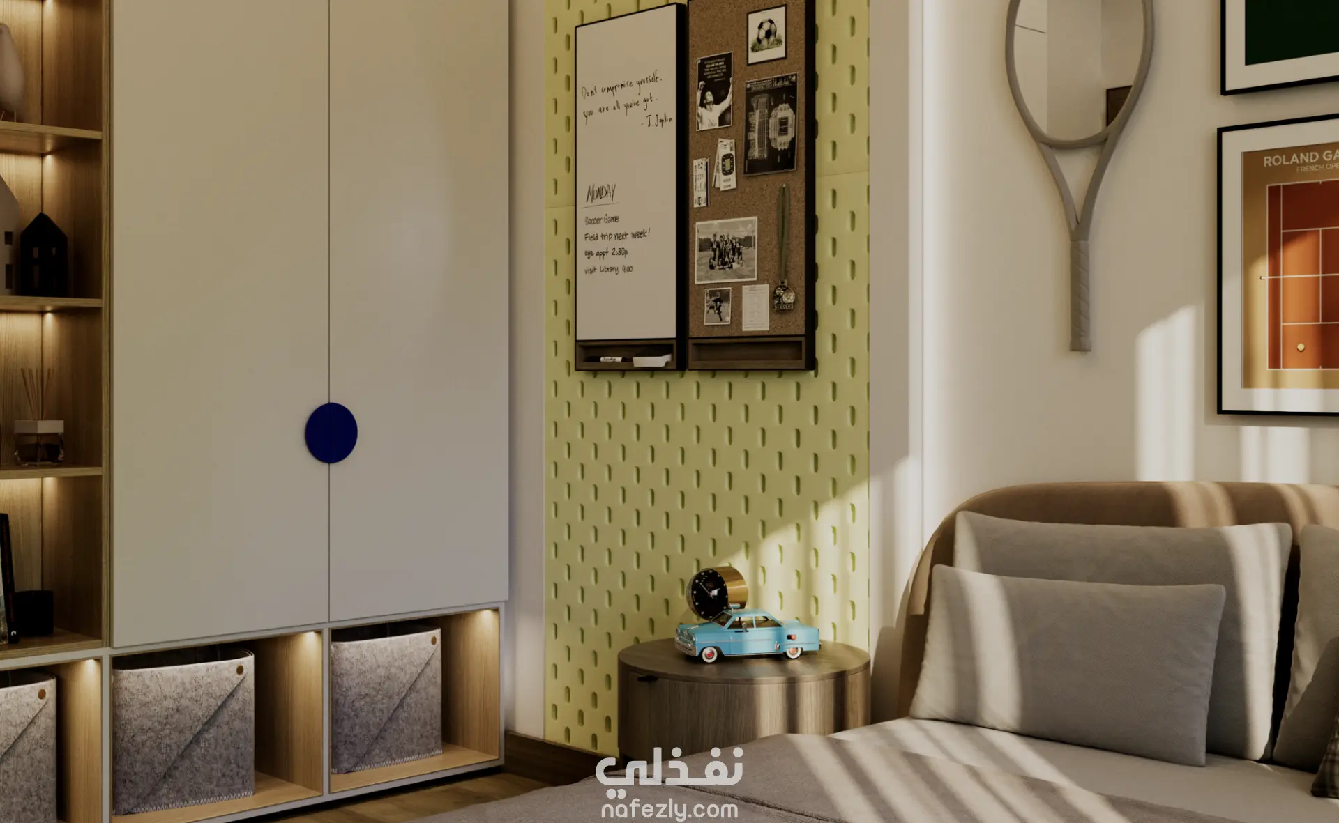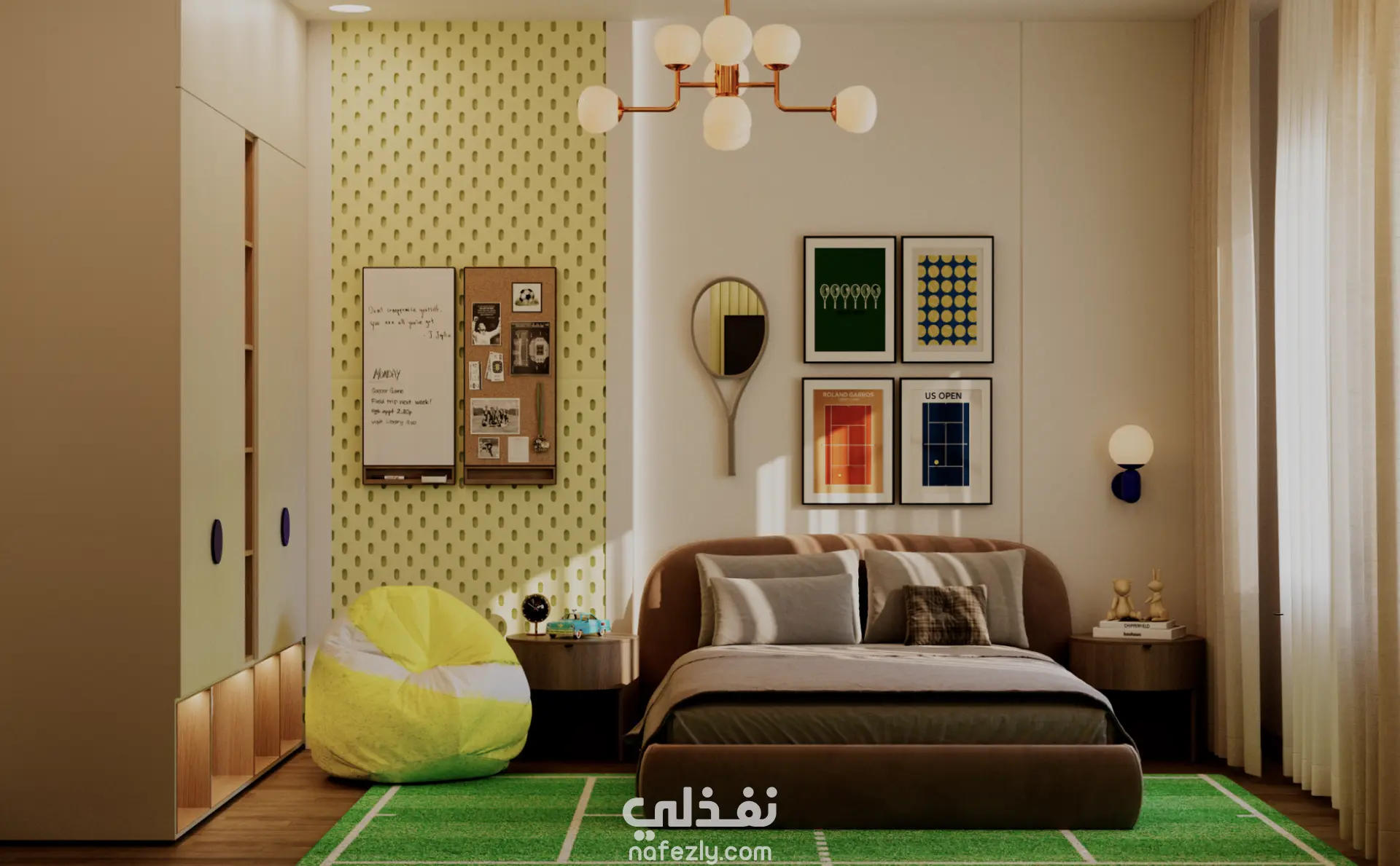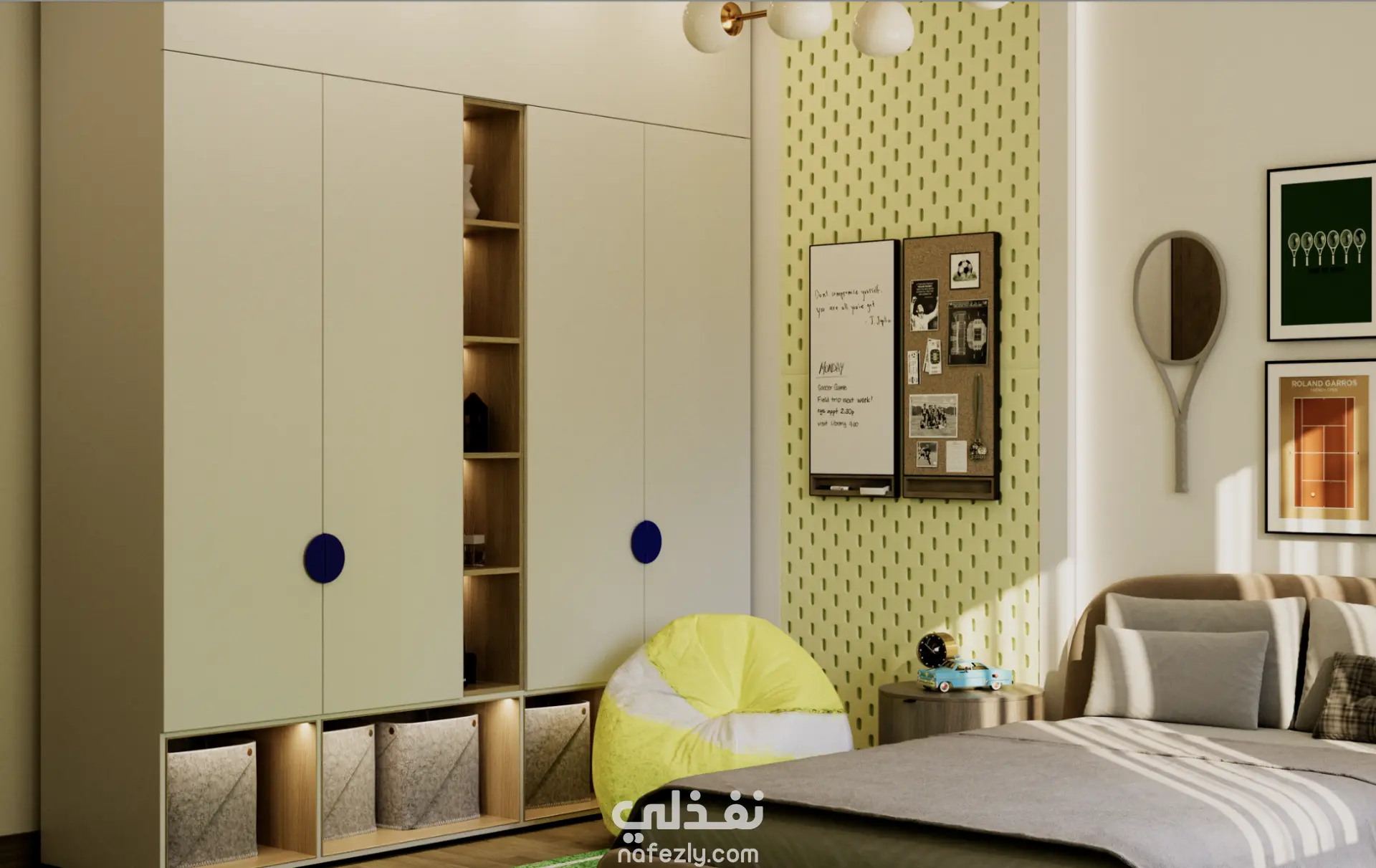 صممتُ غرفة لطفل يبلغ من العمر 11 عامًا عاشق للتنس، مع التركيز على خلق مساحة عملية ومرحة في الوقت نفسه. استخدمتُ لوحات Pegboards لتنظيم الأغراض والأدوات الرياضية بطريقة ذكية وعملية، ما يعزز الوظائف اليومية ويشجع الطفل على النظام والاستقلالية. اعتمد التصميم على ألوان ناعمة وحيوية توازن بين المرح والهدوء، مع لمسات شبابية تعكس شخصية الطفل واهتماماته، لتصبح الغرفة مساحة مريحة، محفزة، وممتعة للنوم واللعب والدراسة.