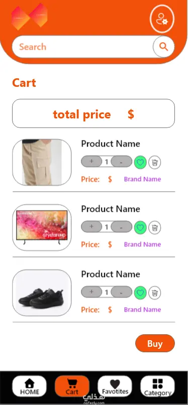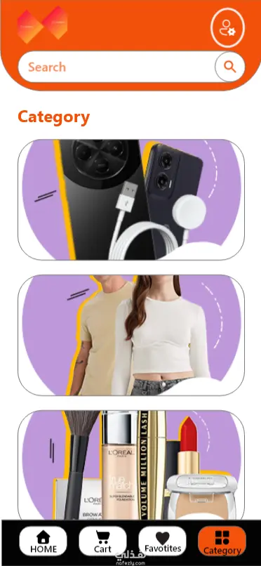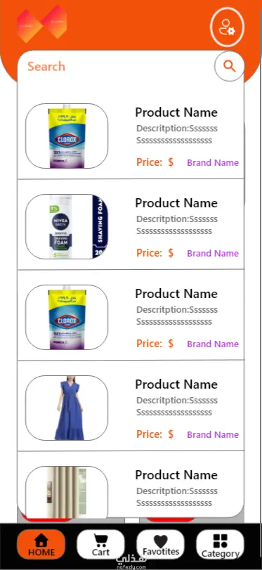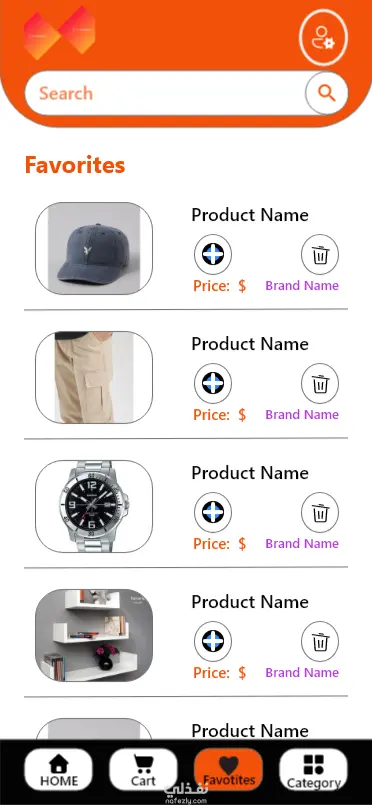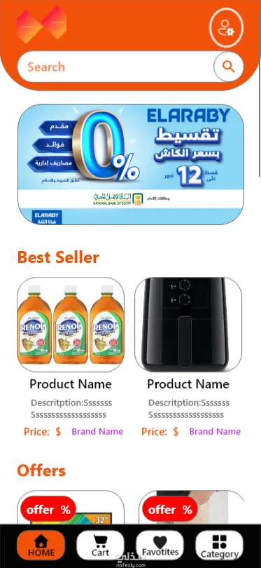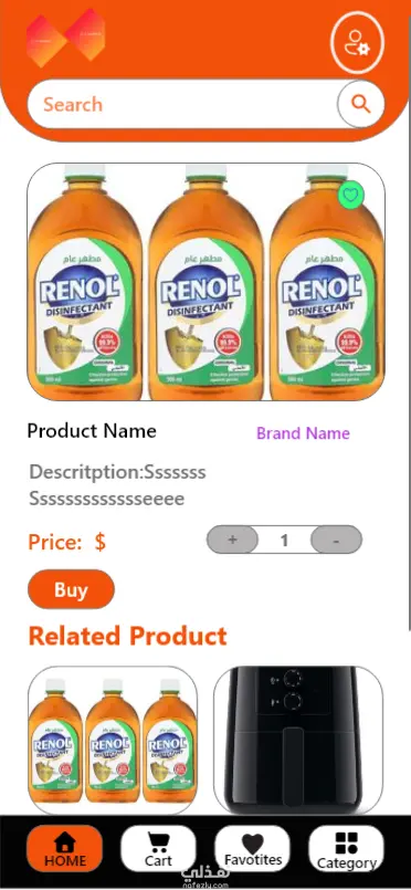 تصميم باقي شاشات الابليكشن وعمل شاشات اولية وشاشات نهائية للمشروع وكان يتضمن 6 شاشات وهي ال home, category, fav, cart, cart details, search ,ذلك باستخدام adobe xd
