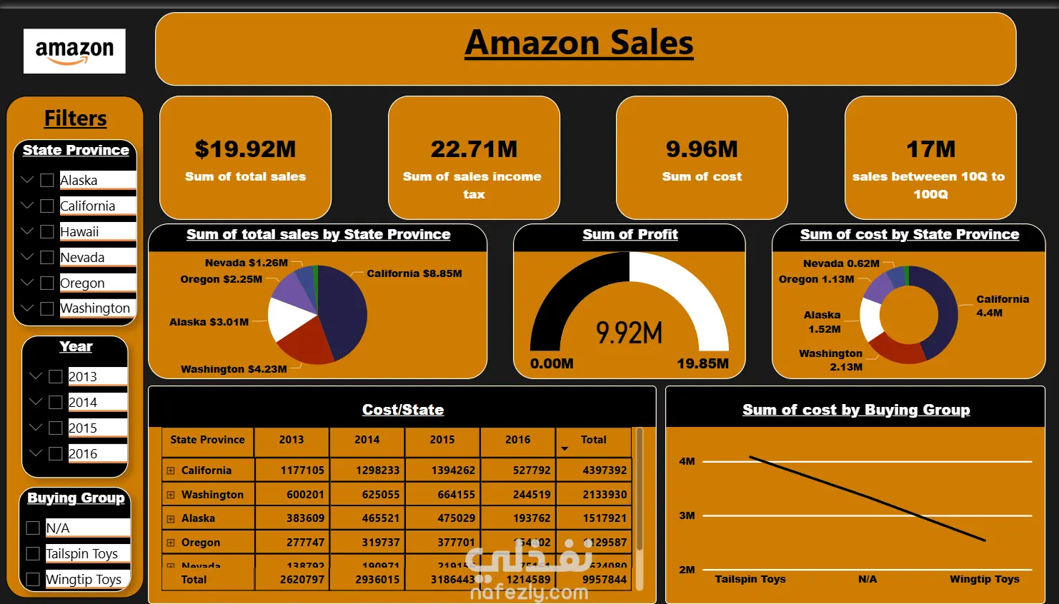 تحليل أداء مبيعات أمازون حسب الولايات والسنوات لتحديد المناطق الأكثر ربحية وتقديم رؤى تدعم اتخاذ القرار.