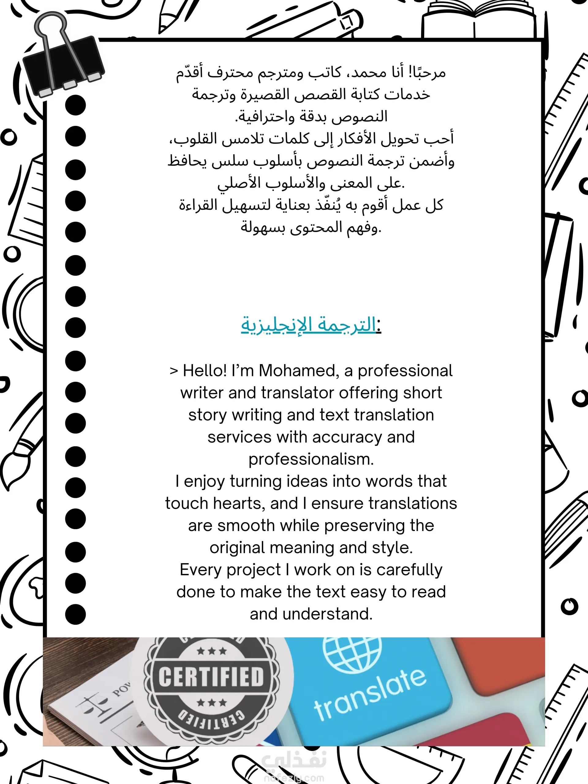 مرحبًا! أنا محمد وأقدّم خدمة ترجمة احترافية لأي نصوص تريدها.