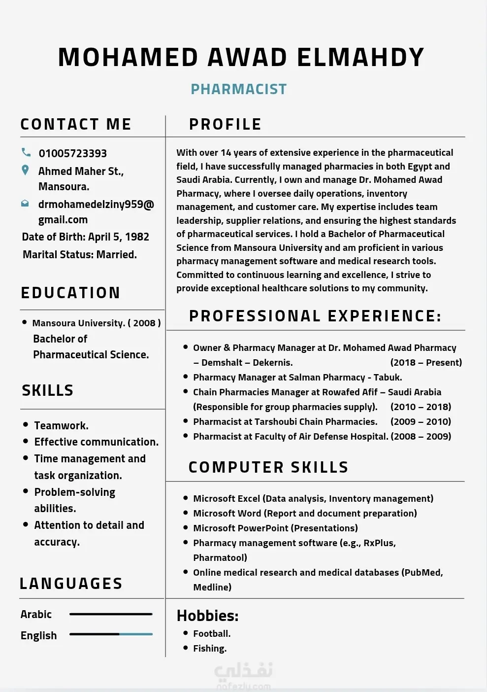 انشاء سيرة ذاتية احترافية لدكتور صيدلي