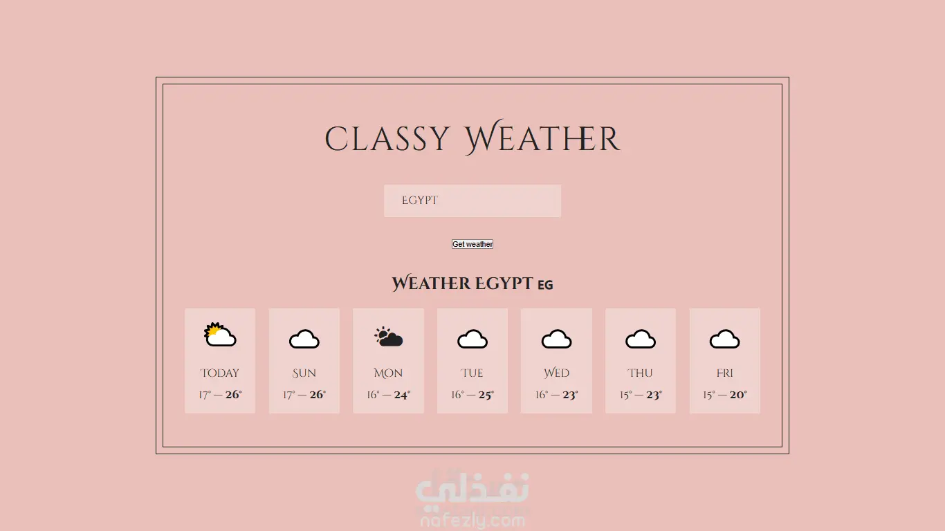 ️ تطبيق Weather Search App لمعرفة حالة الطقس قمت بتطوير موقع ويب بسيط وأنيق باستخدام React.js يتيح للمستخدمين البحث عن حالة الطقس الحالية في مختلف الدول بطريقة سريعة وسهلة. يتميّز التطبيق بتصميم نظيف وسهل الاستخدام مع أداء سريع وتجربة متجاوبة على جميع الأجهزة. مميزات التطبيق: البحث عن حالة الطقس حسب اسم الدولة عرض درجة الحرارة، نسبة الرطوبة، والحالة الجوية العامة (مشمس ️ – ممطر ️ – غائم ️) واجهة مستخدم بسيطة وسلسة تصميم سريع ومتجاوب