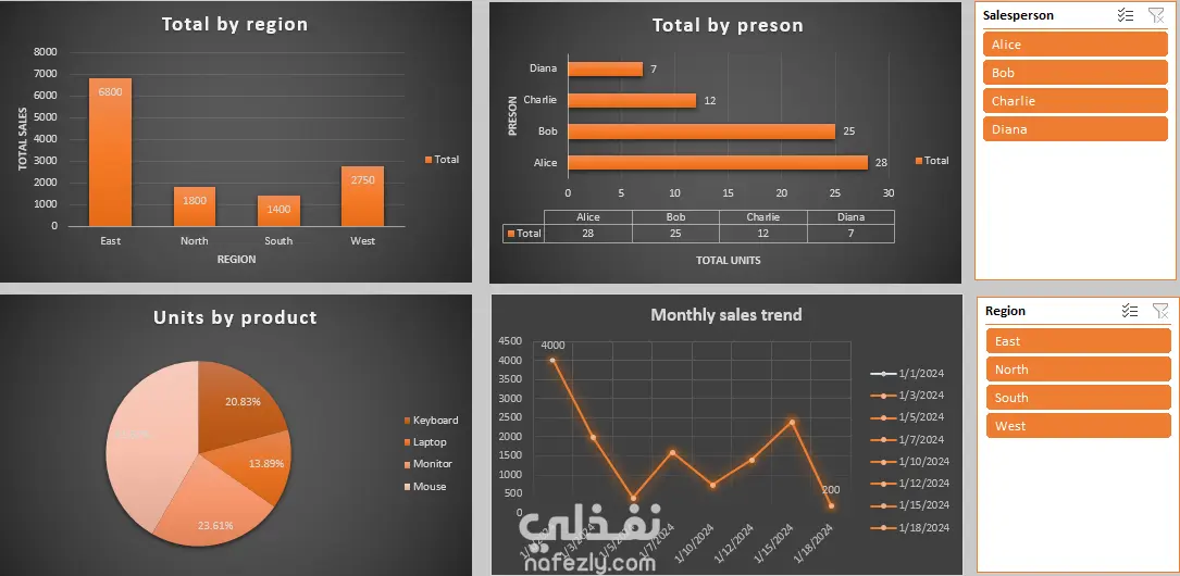 أكثر مندوب مبيعات: Alice بإجمالي 28 وحدة مباعة.