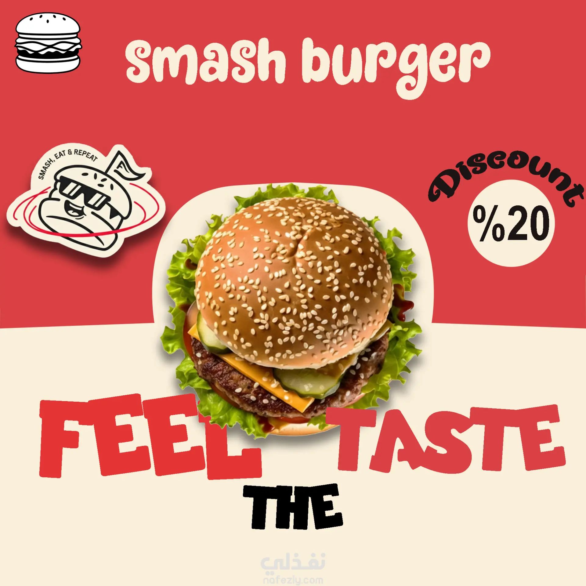 تصميم إعلاني جذاب لمطعم برجر (Smash Burger) باستخدام ألوان مبهجة (الأحمر والبيج) مع إبراز صورة البرجر في المنتصف بشكل واضح يلفت الانتباه.