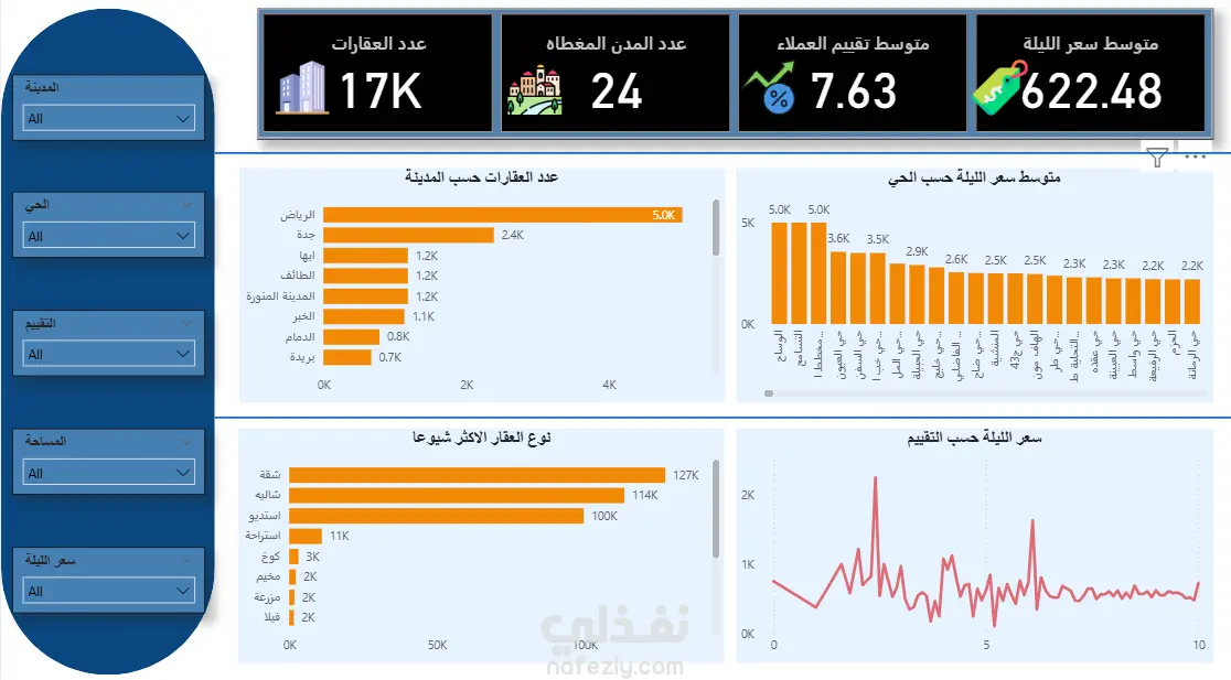 Objective: To design and build an interactive business intelligence dashboard to analyze the short-term property rental market across Saudi Arabia. The primary goal was to provide investors, property managers, and market analysts with a comprehensive tool to identify trends, evaluate pricing, and make data-driven investment decisions.