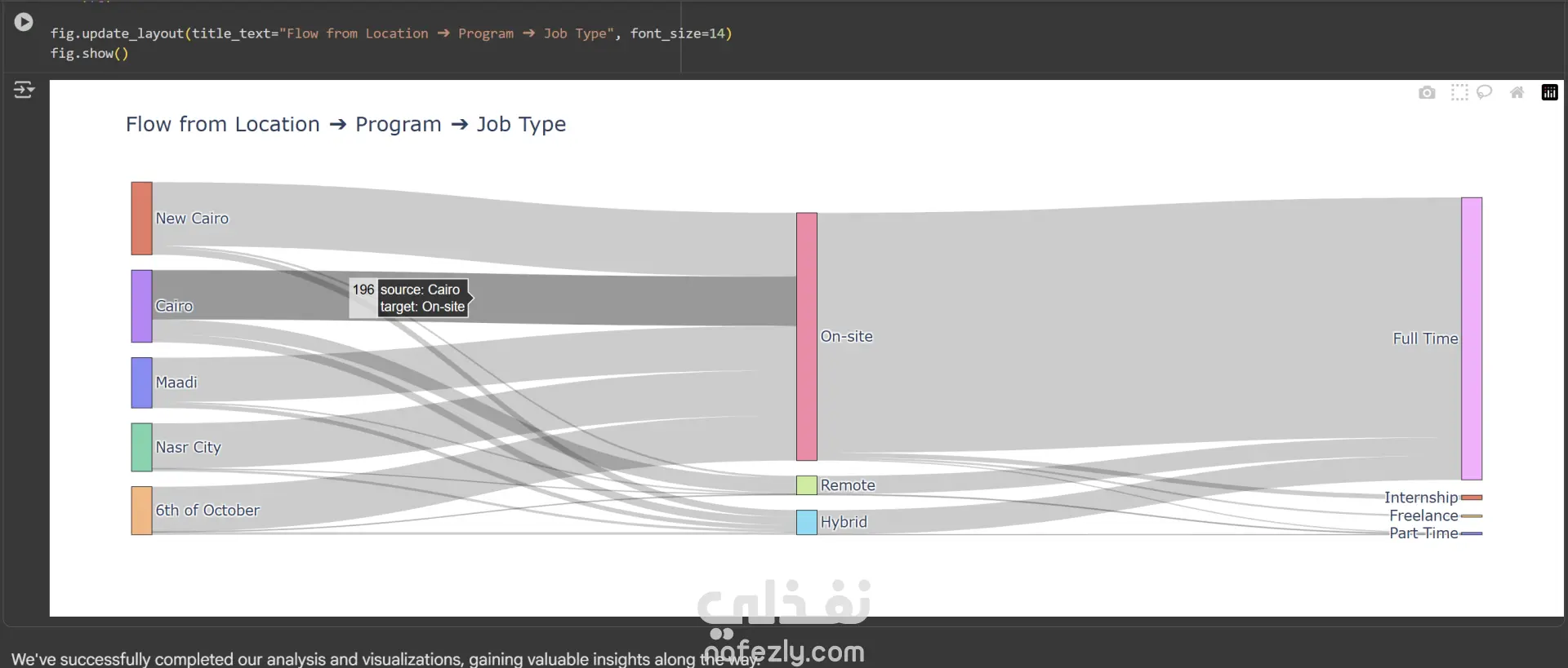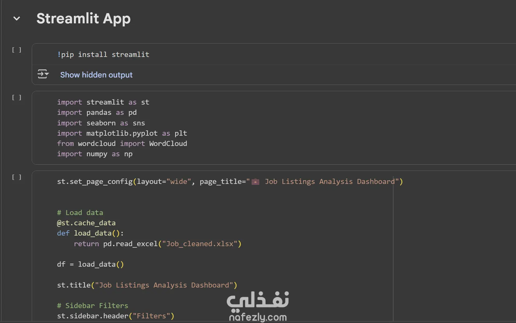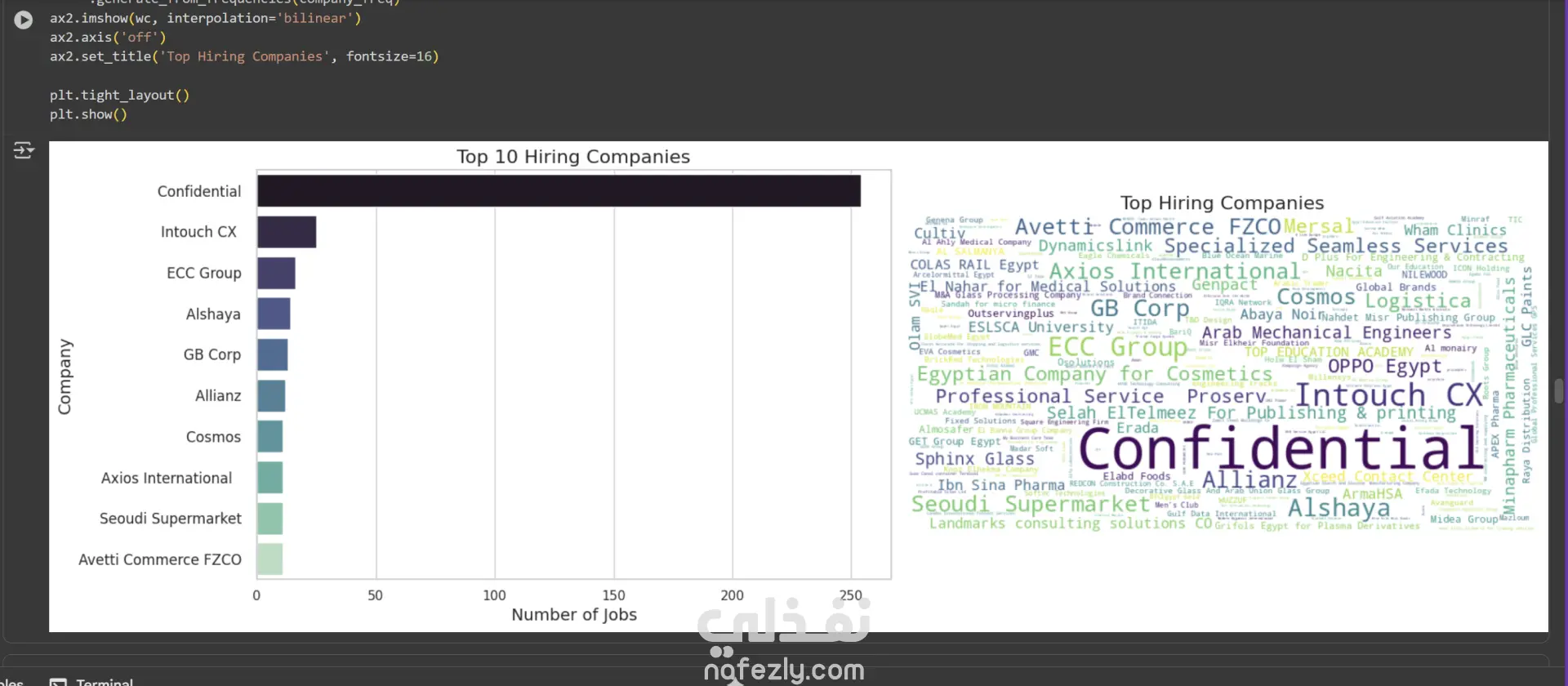 إنشاء رسوم بيانية وDashboards لتوضيح النتائج بشكل واضح، مع تقديم Insights قابلة للتطبيق تساعد في فهم سوق العمل وتحليل الوظائف.