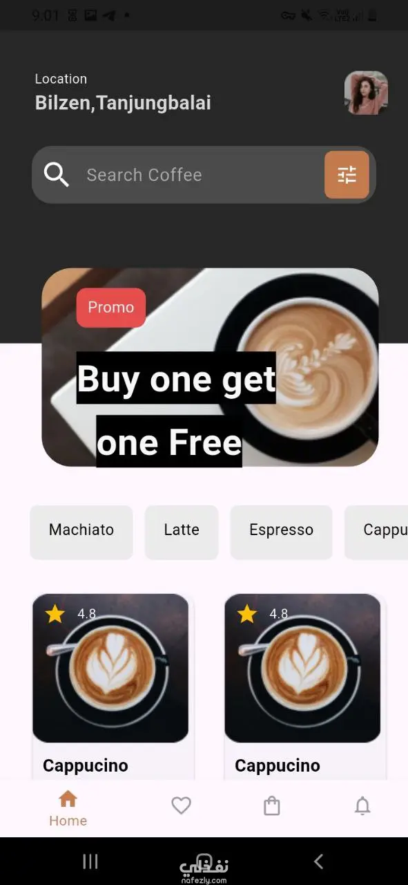تم تنفيذ تطبيق Coffee Shop App باستخدام Flutter بتصميم عصري وواجهة مستخدم احترافية تحاكي تطبيقات المقاهي الحقيقية.
